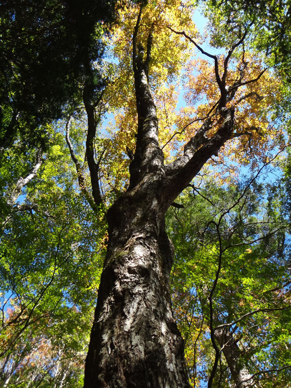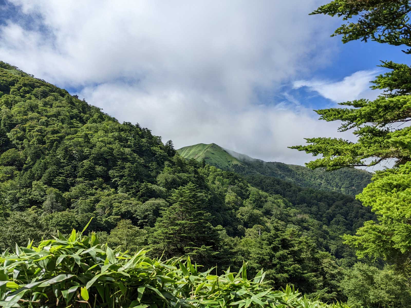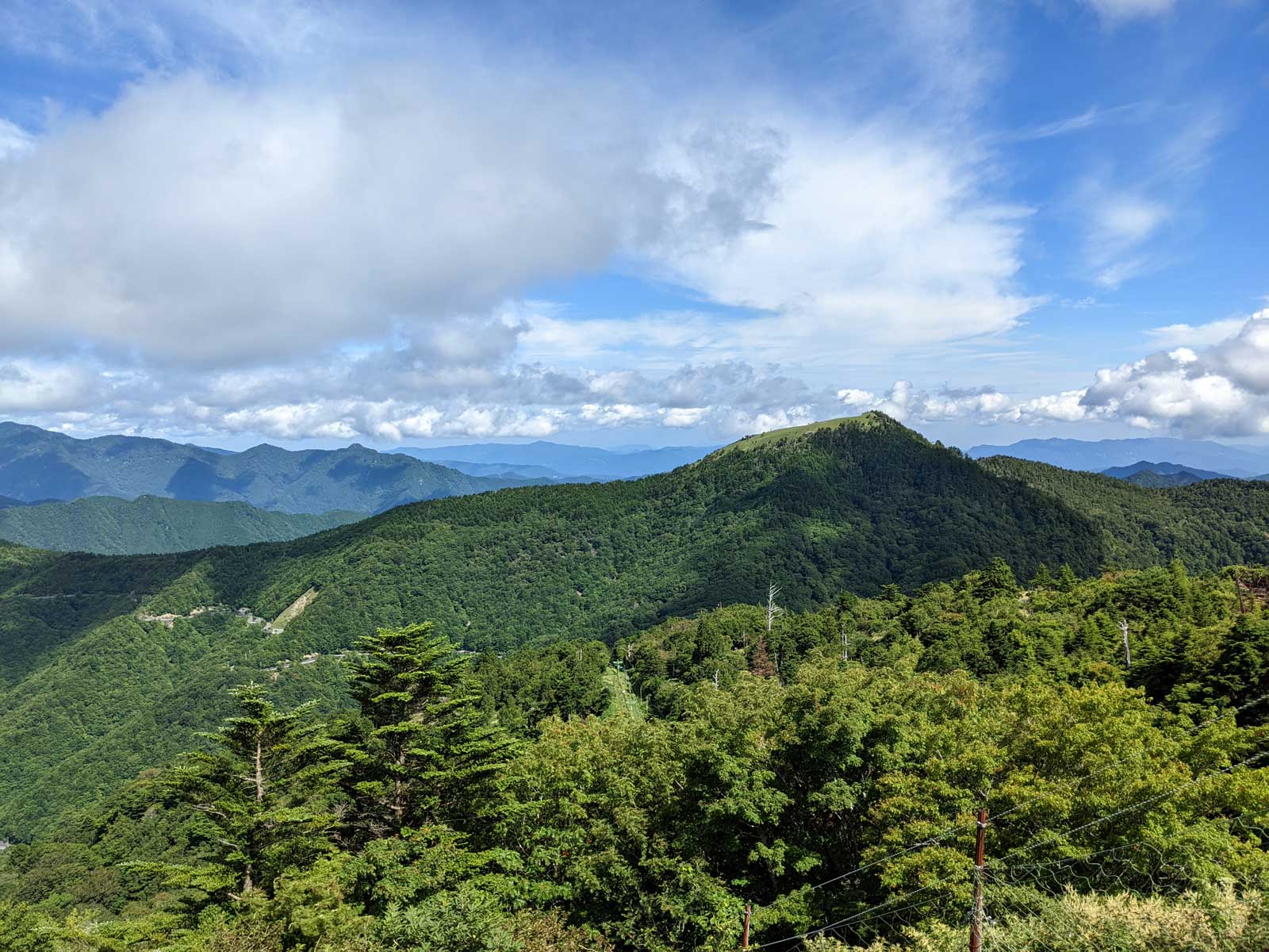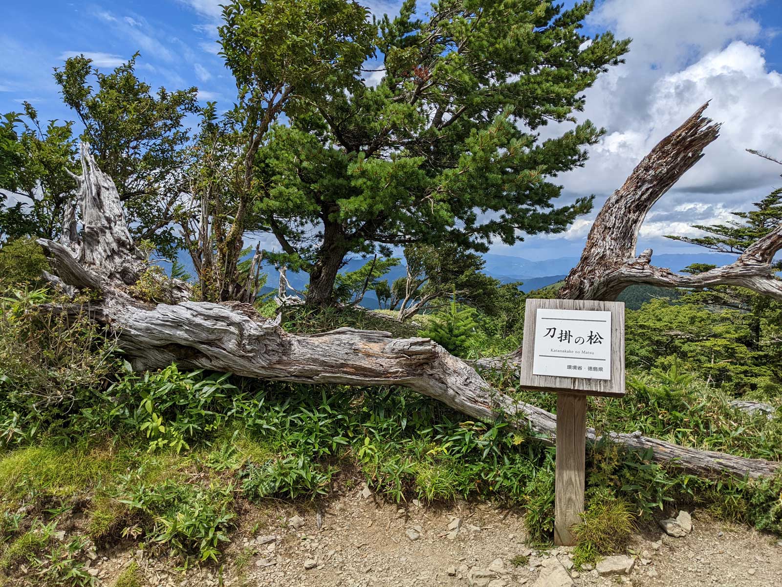さて、次のポイントは追分だ。 追分に向かって歩いていく。 途中で60歳くらいの夫婦を追い越す。 この夫婦は剣山に行きたかったらしいが、国道通行止めのため、仕方なく一ノ森に来たみたい。 途中で巨大なブナの木を見ながら、すぐに追分まで到着。 追分でも休憩をする。 さて、ここからのルートは、お花畑方面に向かって歩いていく。 確か2年前だと思うのだけど、追分~お花畑区間で崩落があり、それから通行止めになっているルート。 だが、山小屋で聞いた話だと、崩落したのは50mくらいで、上から迂回すれば通れるとのことだった。 聞いたのも2年前なので、今はどうなっているかわからないが…… それと、お花畑→追分は歩いたことがあるけど、追分→お花畑は歩いたことがないので、ぜひ歩いておきたいルート。 もしどうしても危ないなら戻ってくればいいし。