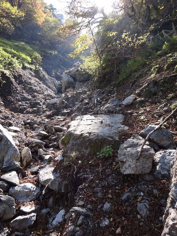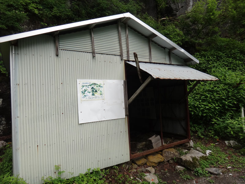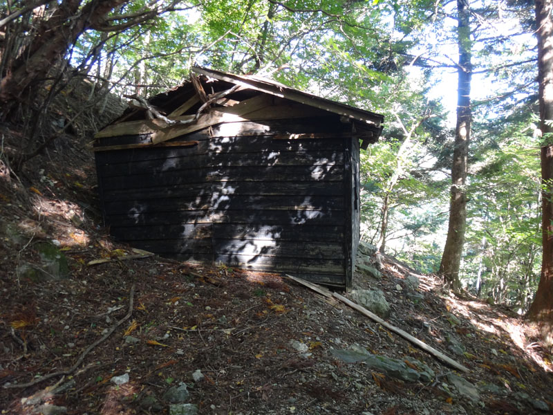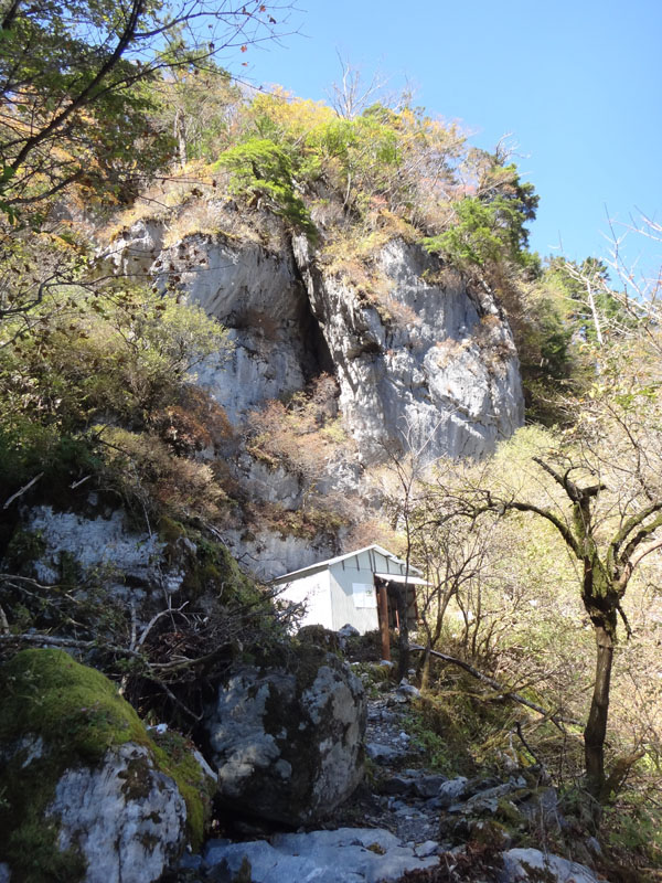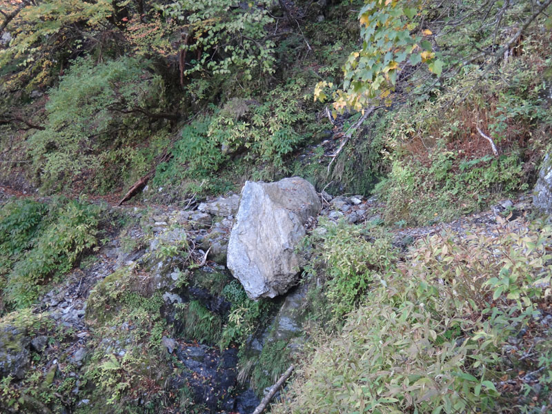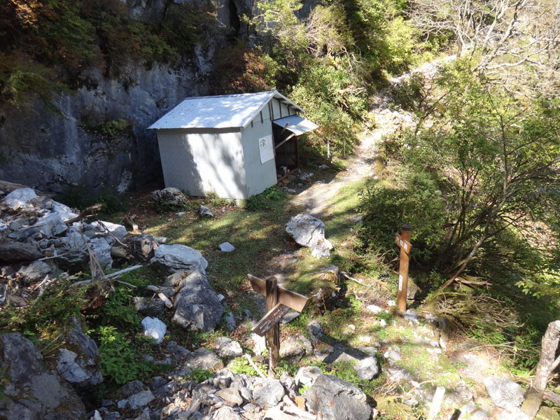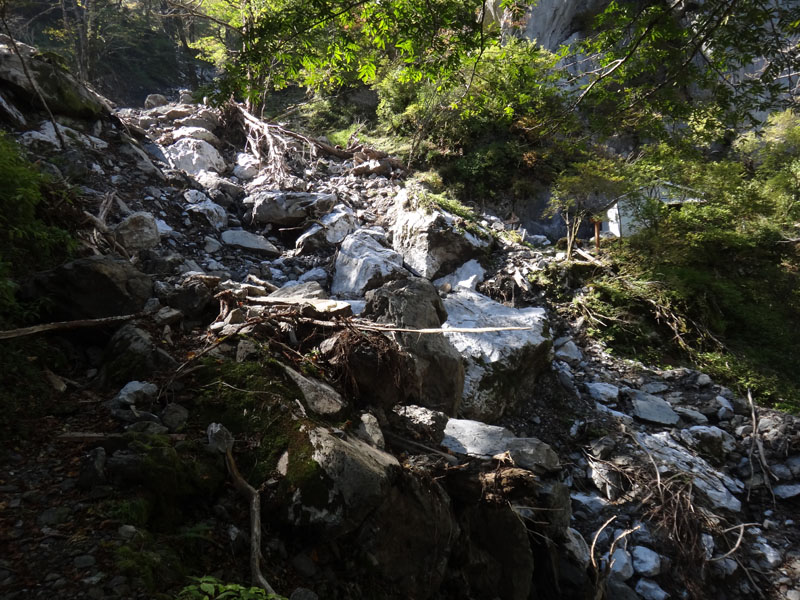 そこから下の道が全くなにもなくなっている。 ここには乏しいながら下の小屋から鎖場へ登っていく道があったはず。 それらがなくなっている。 あるのはゴロゴロとした大岩ばかり。 これは鎖場の両サイドの崖が崩れたのか。 こんな状態になっているとは知らなかった。 下りるのには問題ないが、これは通行止めにしたのに納得した。 下の小屋は、かろうじてがけ崩れの被害を免れていた。 あと数m崖の方にあったら小屋は崩壊していたな。