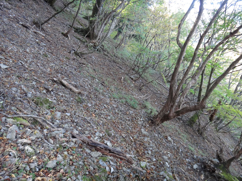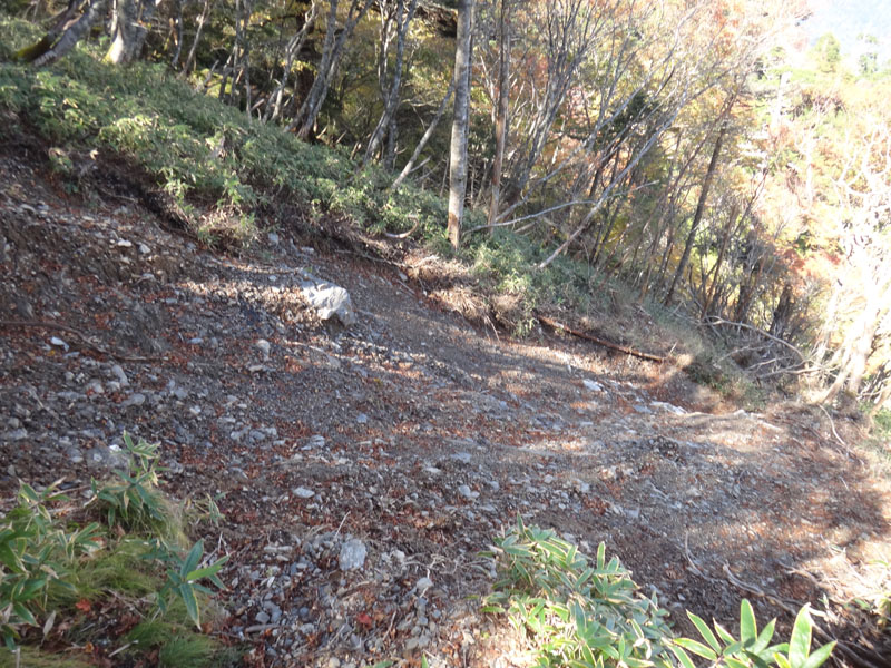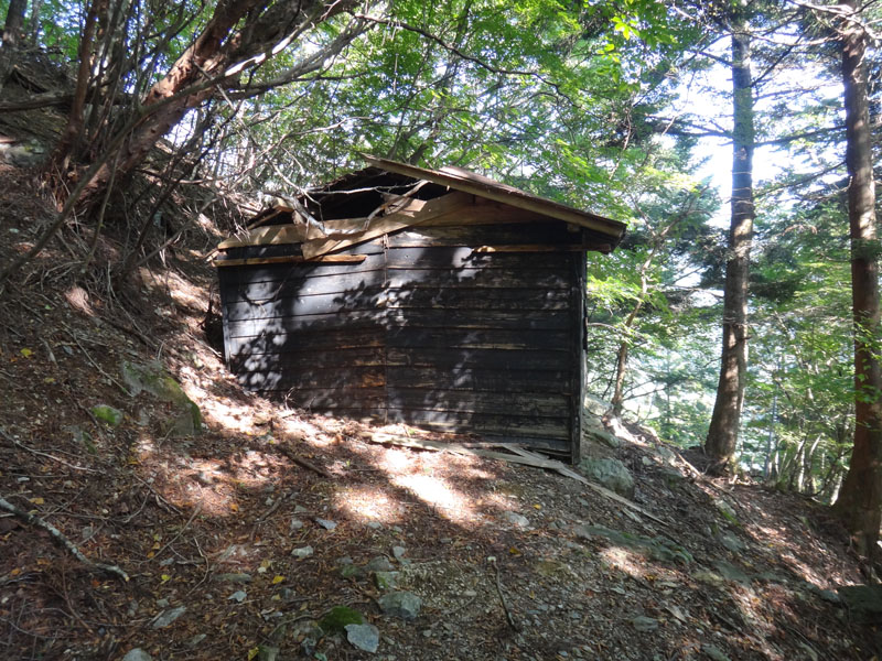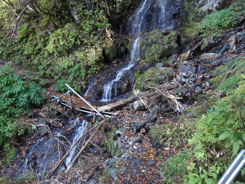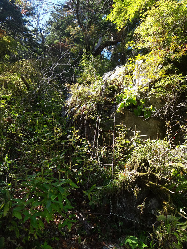 もう少し下りたら、鎖場を迂回するルートが左の方にあるのだけど、そのルートが、先ほどのがけ崩れで消えている。 がけ崩れの中には小屋の崩壊したようなものも見える。 これは、6月~今までの間に新たにがけ崩れが発生したのか。 まぁ向かうは迂回路ではなく鎖場なので、鎖場に降りていく。 鎖場までの道も雑草や落ち葉が多かった。 あまり人があるいていないのかな?
