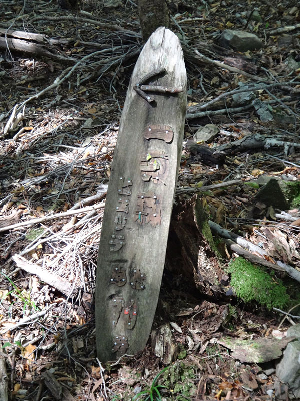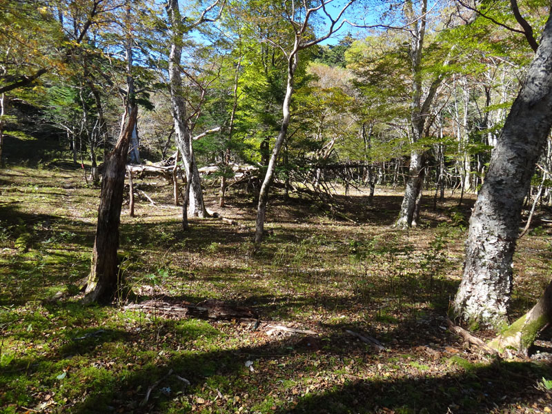 そのまま進んでいき、お花畑のちょっと手前で、崩落地点が出てきた。 幅20~30mくらいか? 土砂が流れてきた感じになっている。 下からは迂回できないので、やはり上からの迂回になるか。 足元が緩く、砂が簡単に崩れるので慎重に。 一応ピンクテープが貼ってあるので、誰かが崩落地点の迂回ルートを策定しているみたい。 まぁ慎重に歩けば問題ない程度の箇所で、崩落地点は通過。 大きな木々に囲まれた広場を歩いていると、前に変なものを発見。