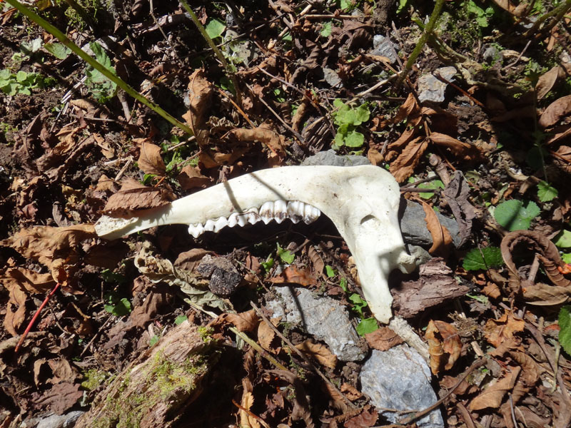 応急処置用のハサミがあるので、それで網を切ってしまおう。 暴れ回っているので、ハサミが刺さらないようにしながら網を切っていく。 片方の角は完全に外れ、もう片方の角に絡まった網も切っていく。 で、無事角から網が外れて、鹿はものすごいスピードで逃げて行った。 すぐ横には、何の動物かわからないけど、アゴと歯の骨が丸ごと落ちていた……
