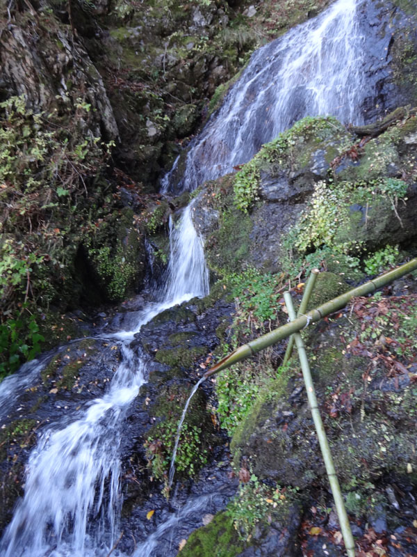 ここからは大剣神社経由で山頂を目指す。 帰りは刀掛けの松方面の最短ルートで帰る予定なので。 6年半より前の大雪の時に、このルートを非常に苦労しながら登ったなぁとか思い出しながら歩いていき、すぐに大剣神社に到着。 妻が「御神水の方に行ってみたい」というので、ここに荷物をおいて、数分下ってきた。 御神水で手を洗ったが、冷たくて気持ちが良かった。