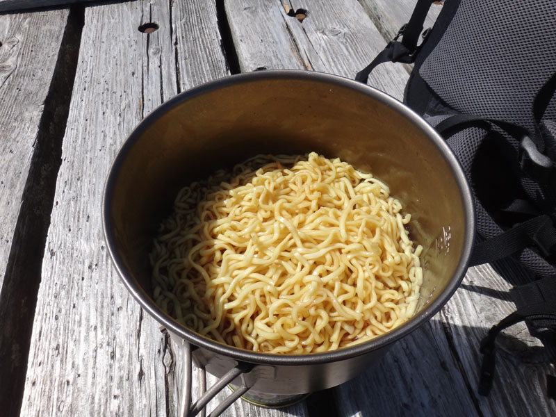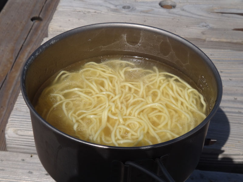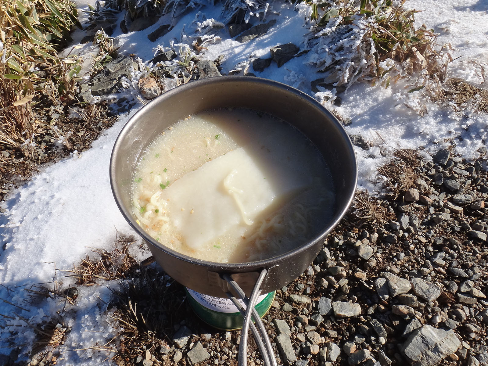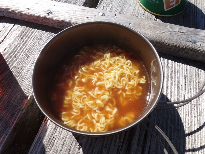 おにぎり食べながらお湯を沸かし、インスタントラーメンを作る。 今日は切り餅を持ってきてあるので、それをラーメンの中に入れて、力ラーメンにする。 が、ラーメンがとんこつだったので、餅と相性が悪かった……