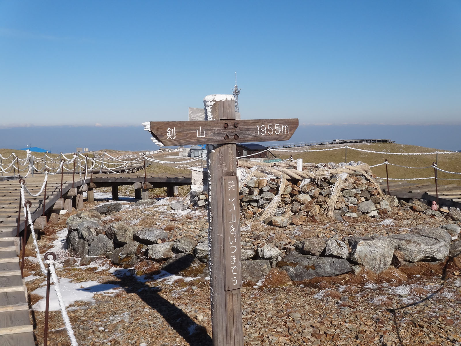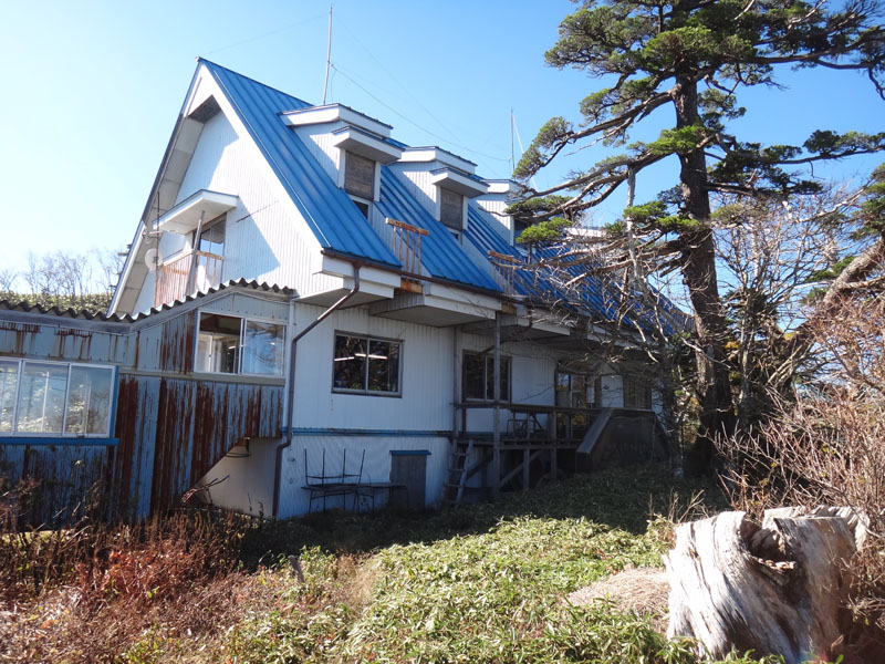 この時間になると、剣山山頂には誰もおらず…… トイレに行きたかったので、トイレに行って下山する。 山頂に新設されたトイレは冬季は閉鎖で、代わりに山小屋前にあったトイレが冬場は使えるようになっていた。