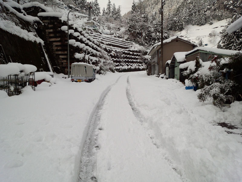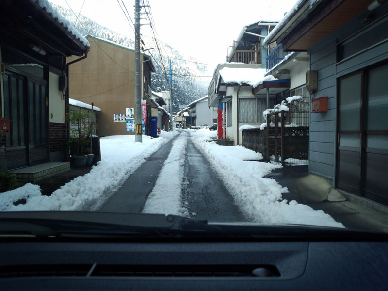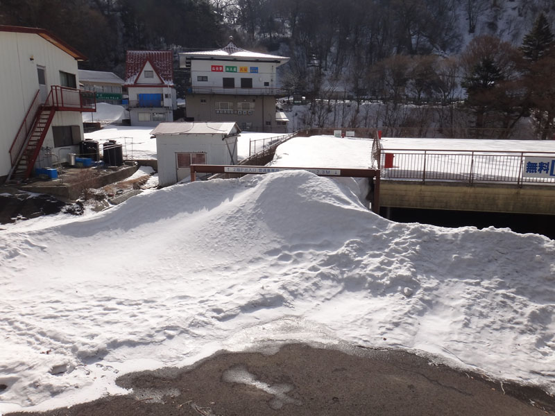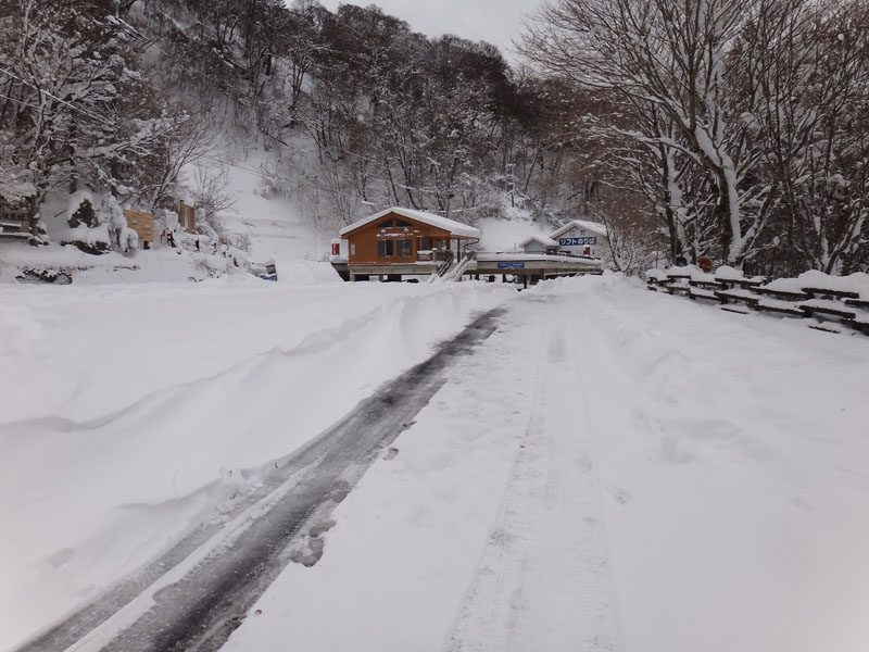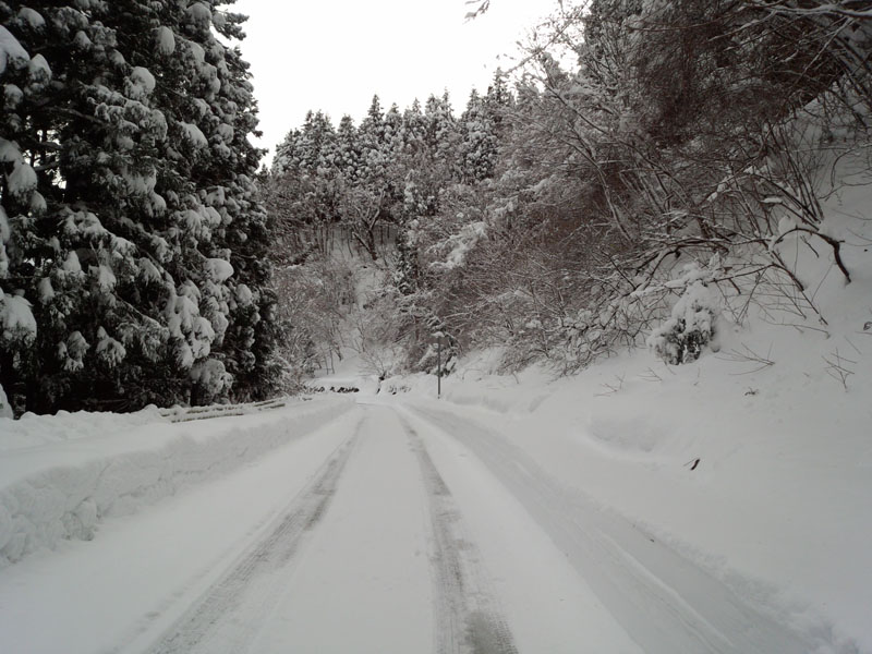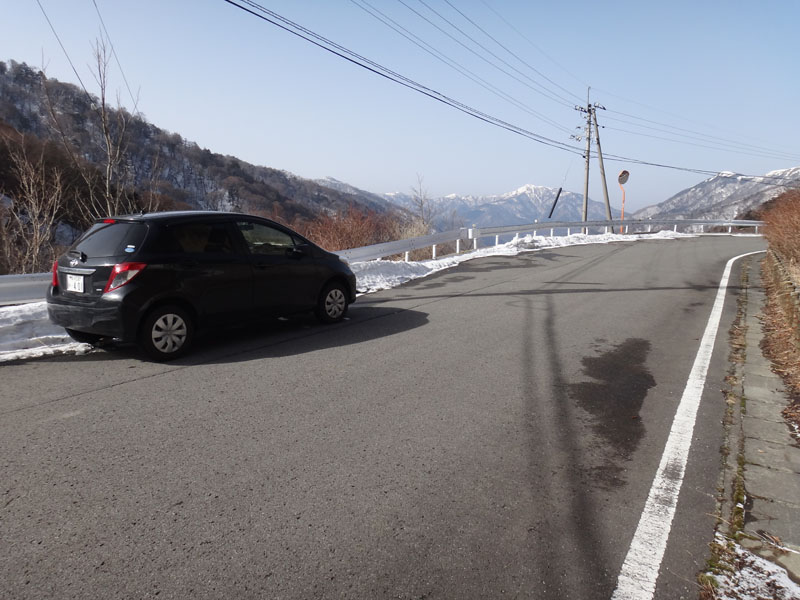国道438号線をそれて、黒笠山登山口の方面の県道261号線へ。 交通量が少ないので雪の量も増える。 川を渡る部分があるのだけど、それを渡ったところで愕然とした。 積雪40cmくらい。 軽トラックが1台通過したようなタイヤ痕しか残っていない。 除雪車は入ってない感じ。 これは車高も高くないオレの車じゃ走れないな…… ラッセルしながら走れるほどパワフルじゃないし…… あっさりとUターンして引き返す…… さて、どこに行こう。