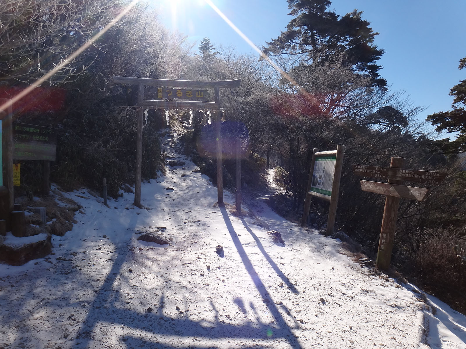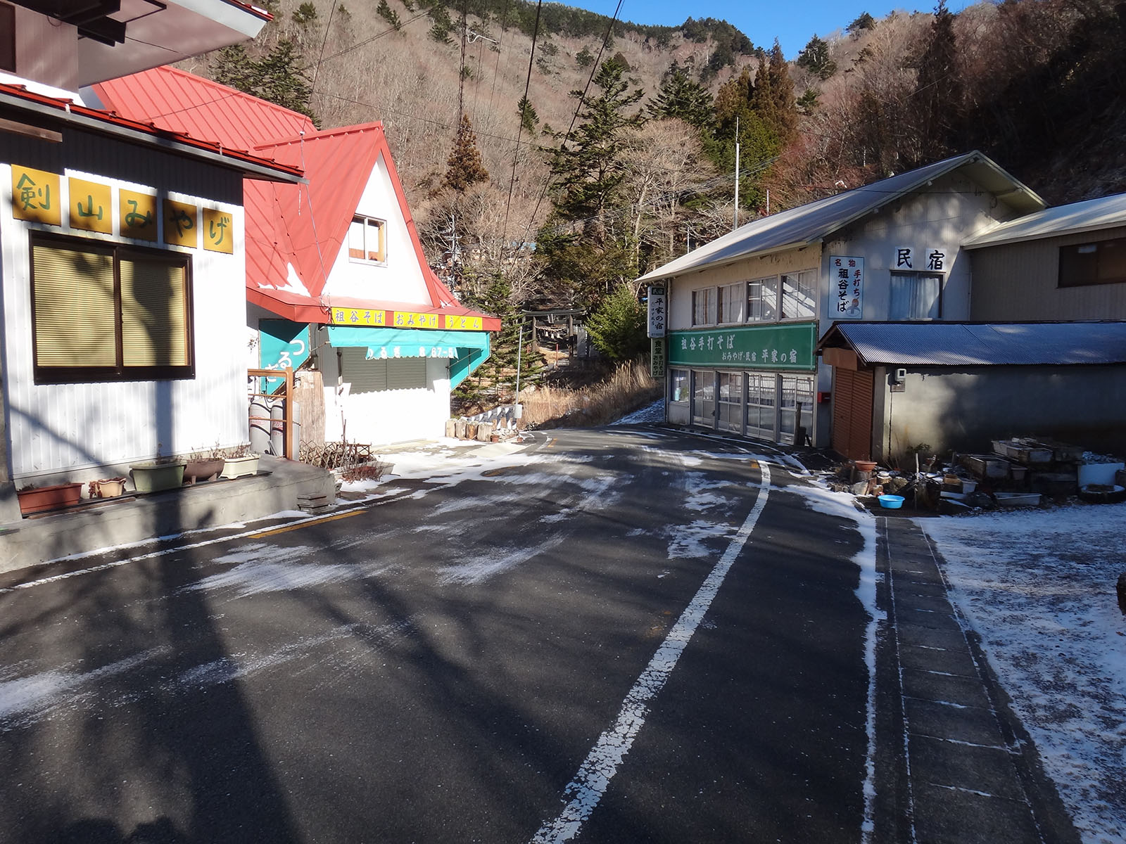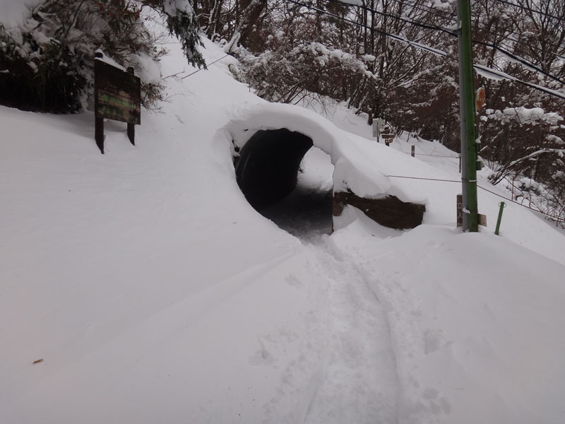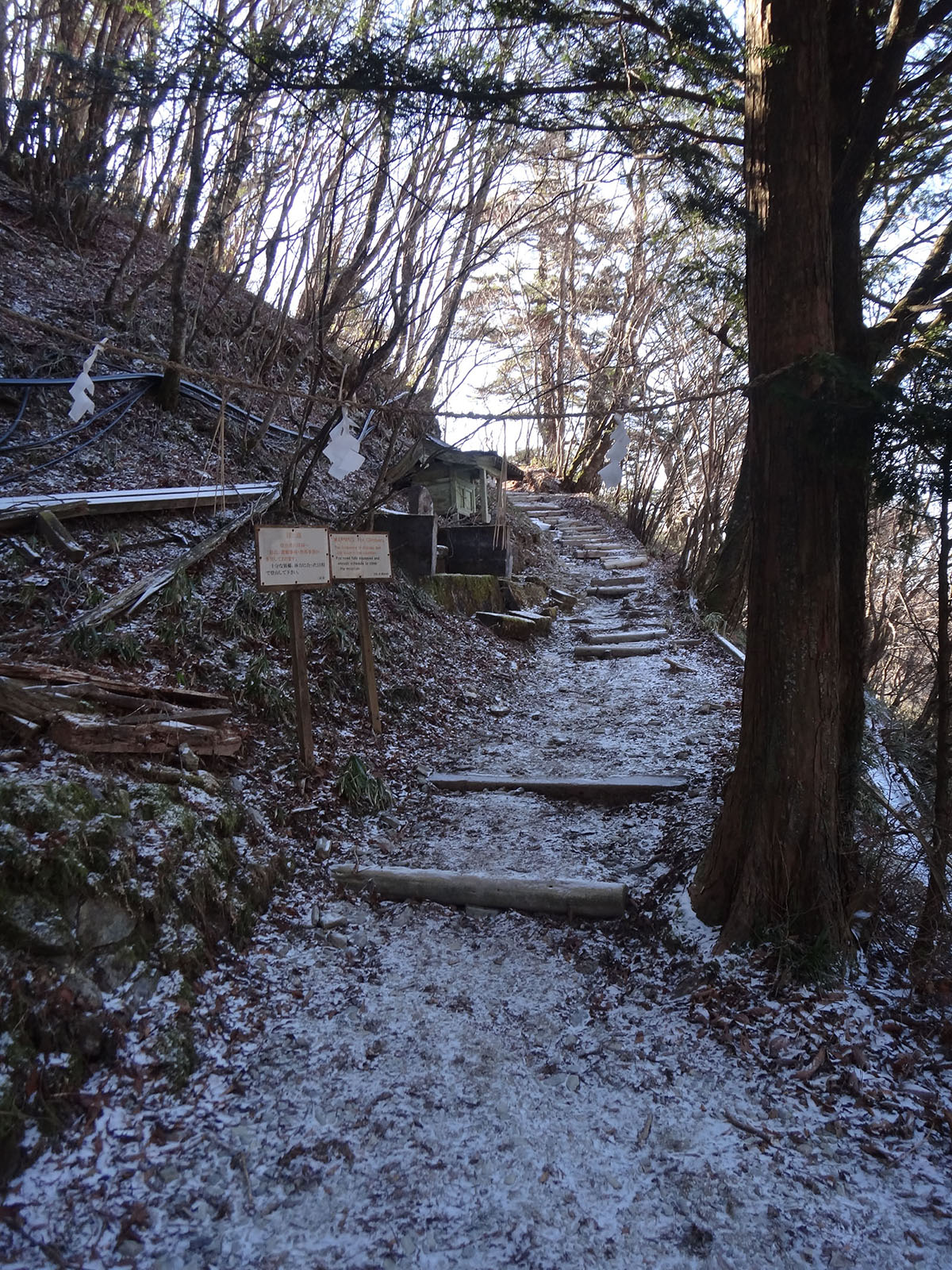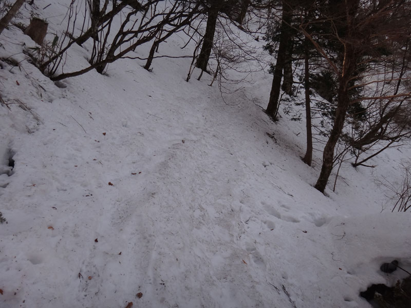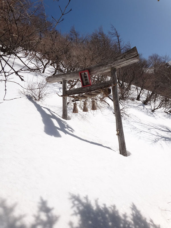 まずは大剣神社まで。 去年の大雪ではかなり苦戦しながら歩いた大剣神社までもほとんど雪が無い。 谷間で常時日陰の場所だけ、少し白い景色だったけれど、それでも積雪5cmくらい。 これがこの日の積雪のピークだった。