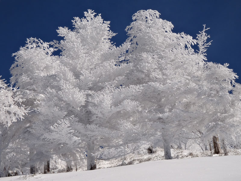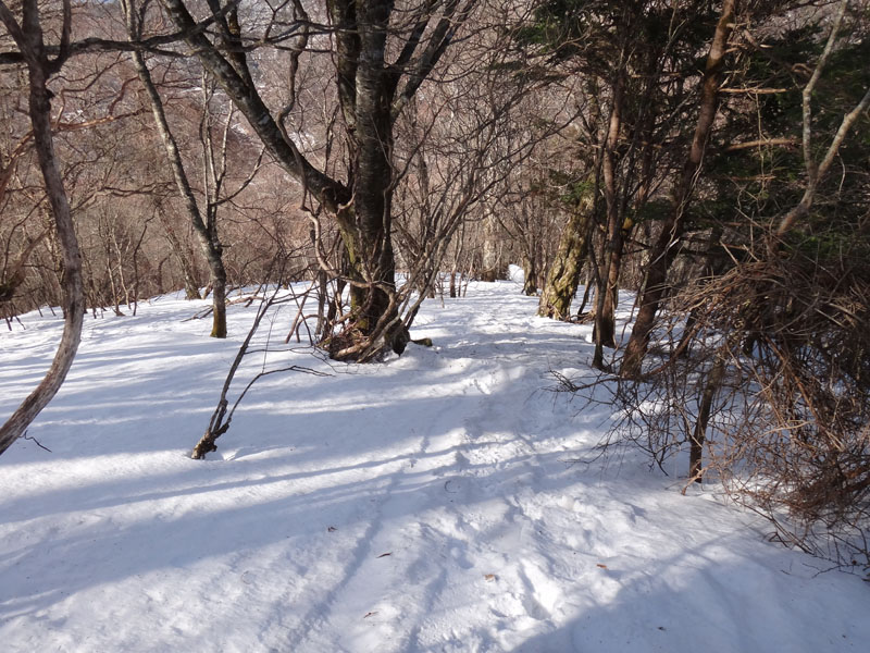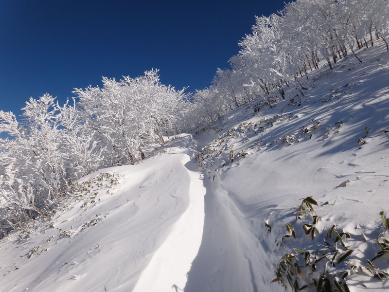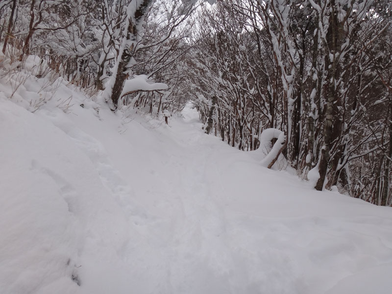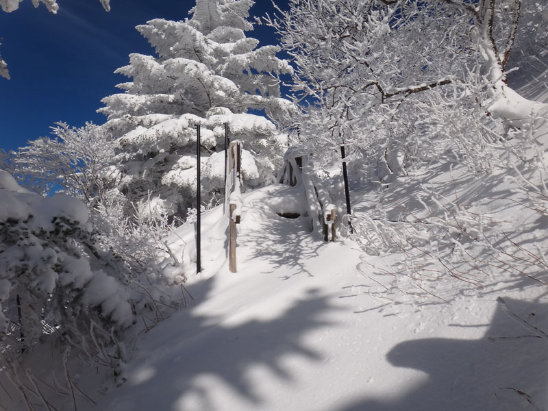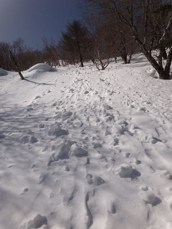 リフトをくぐり、何度か登山道が折り返すあたりで、50歳代くらいの男性2人組を抜かす。 この2人組はスノーシューを履いていて、この人達のトレースだった。 ここから先、スノーシューのトレースは無くなったが、ツボ足のトレースが残っているのでそれを使って歩いて行く。 歩幅は制限されるけど、踏み抜きもせず、体力を使わずに歩いていける。