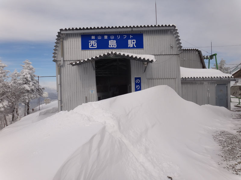 この男性に話を聞いたところ、先頭とのこと。 ここから先はトレースが無い。 男性は最短ルートの、刀掛けの松方面に登って行くとの事だった。 西島で少し休憩していたら、リフトの駅の中から30歳代くらいの男性2人組がやってきた。 丸笹山から続く尾根道をツボ足で直登してきたとのことだった。 すさまじい体力だ…… ラッセルの相当きつかっただろうに……