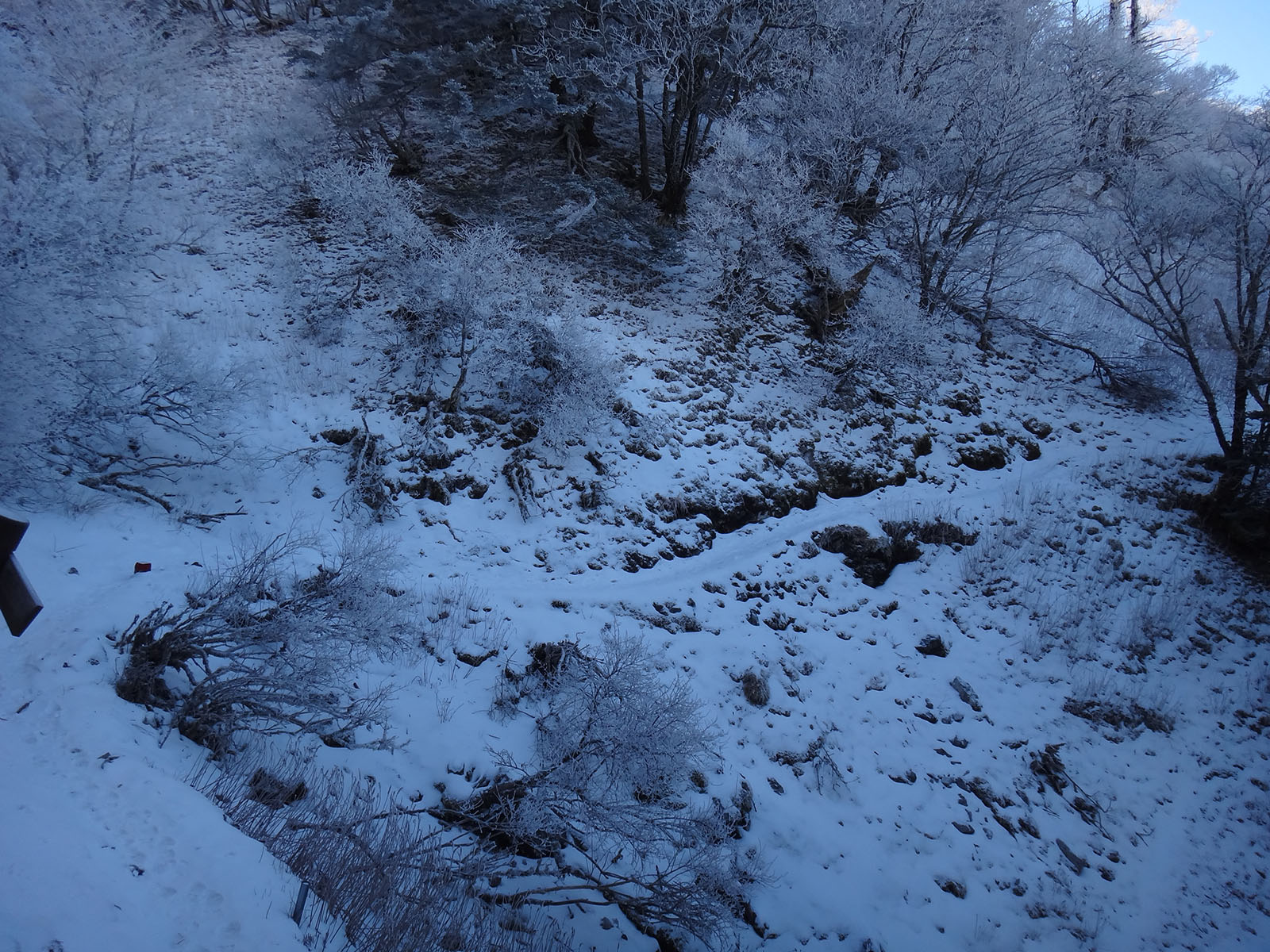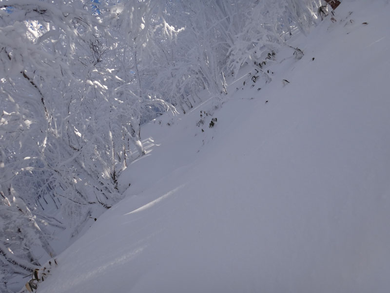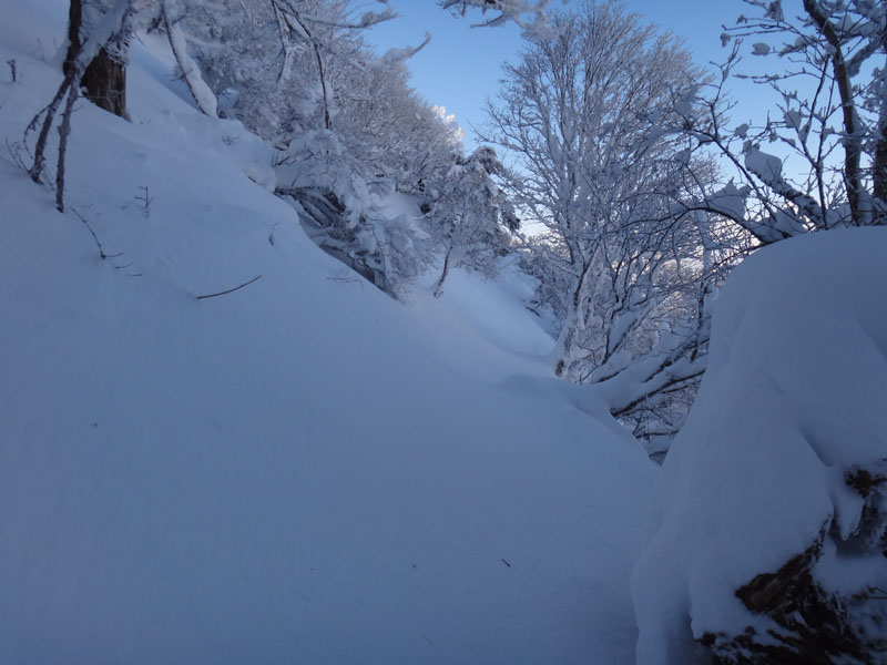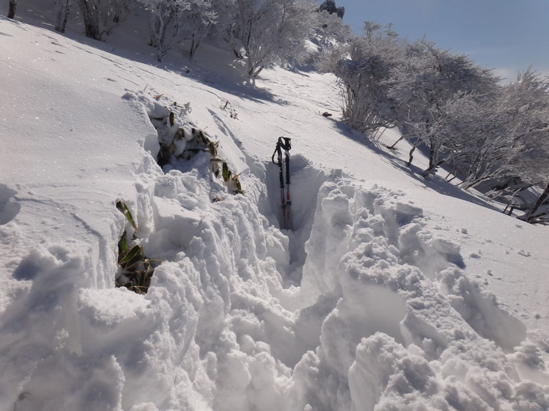 今回も谷間でそれに遭遇。 少しでも沈みにくい場所をと、あちこち踏み抜く。 僅か20mくらいの谷間を抜けるのに10分以上かかった。