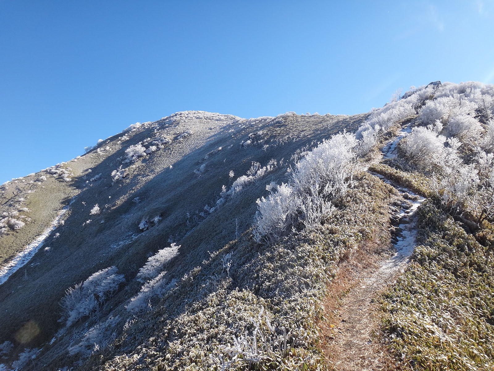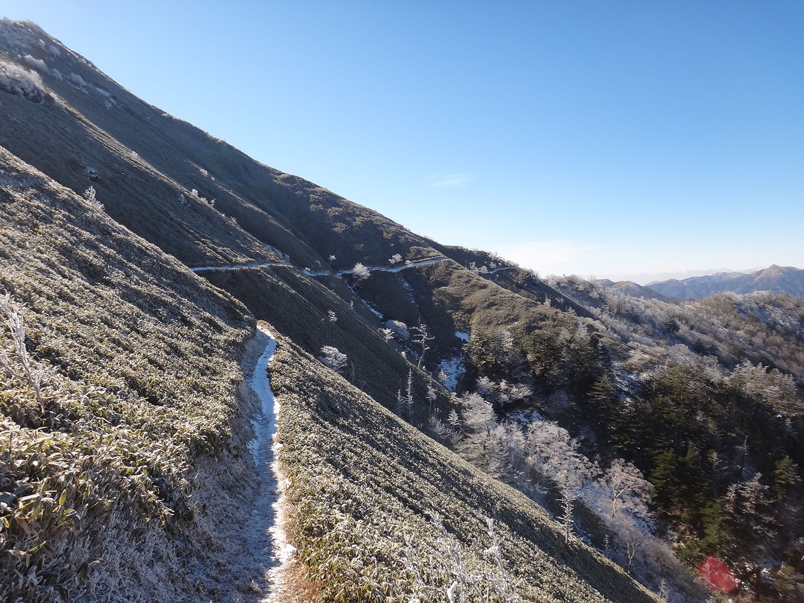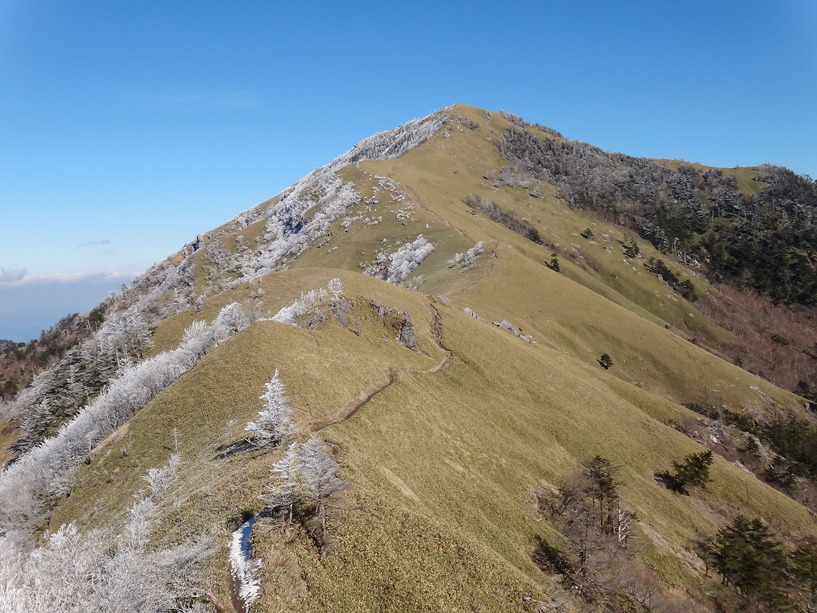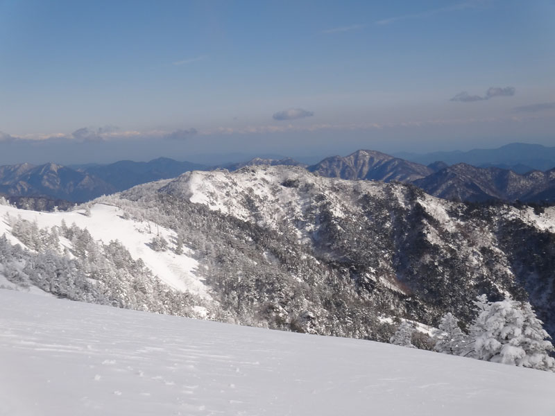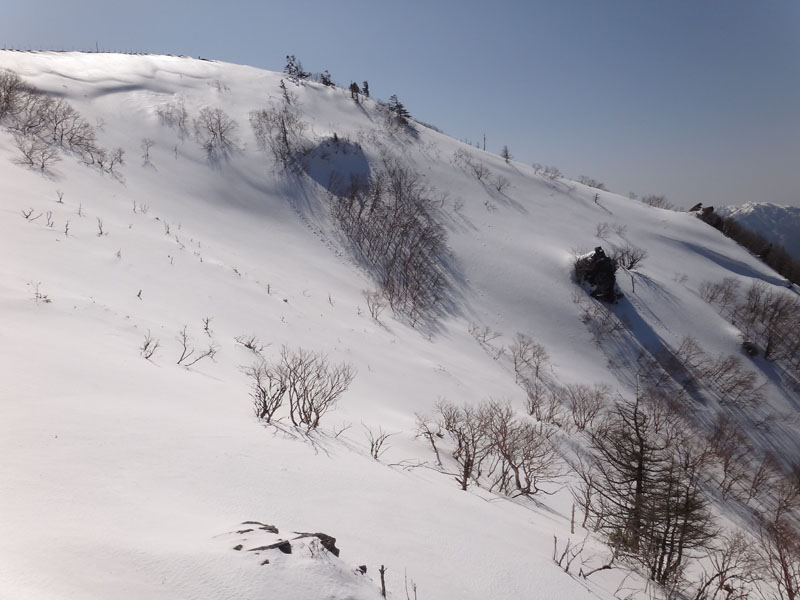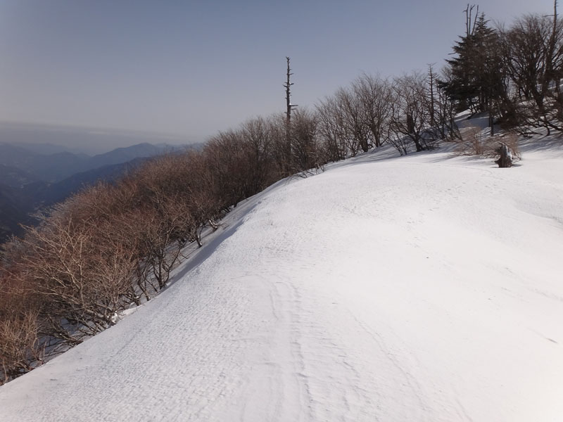 トラヴァースルートも本来、冬場じゃ歩けないのだけど、今日は全く問題が無い。 西側から次郎笈に登る。 こちら側から次郎笈に登るの久しぶりな気がするな。 毎年冬に登っていた丸石~剣山の縦走も2年くらいやってない気がする。 となると、こちらから登るチャンスがあまりない。