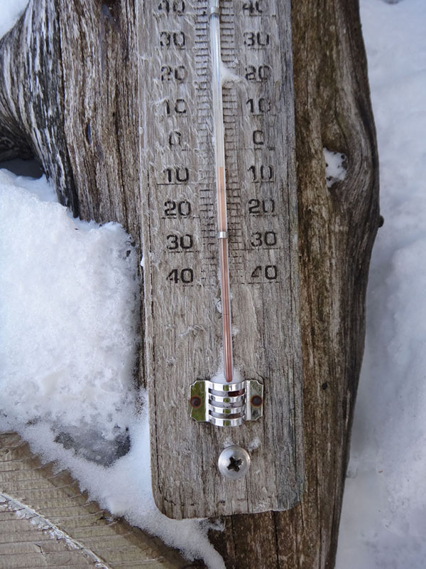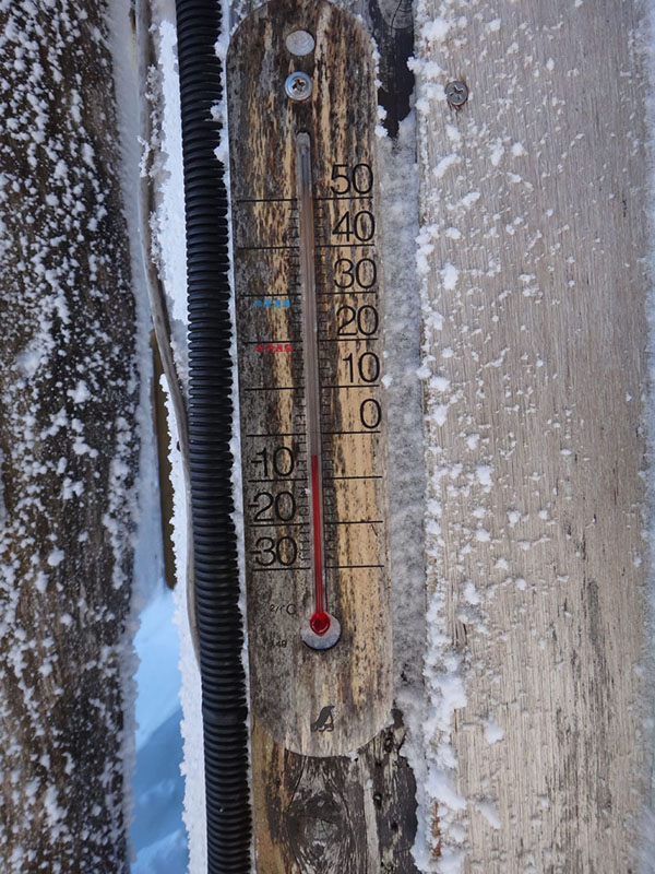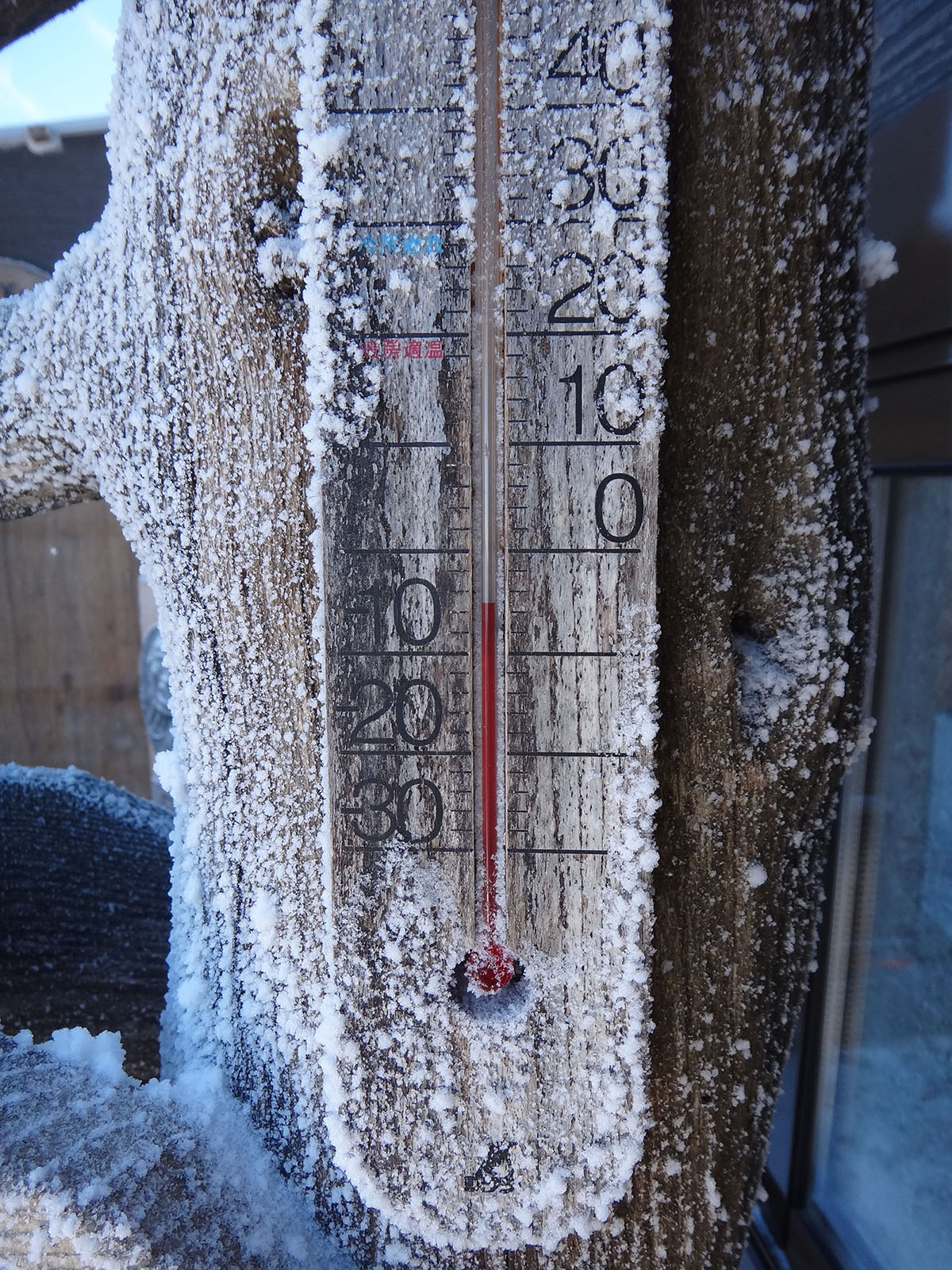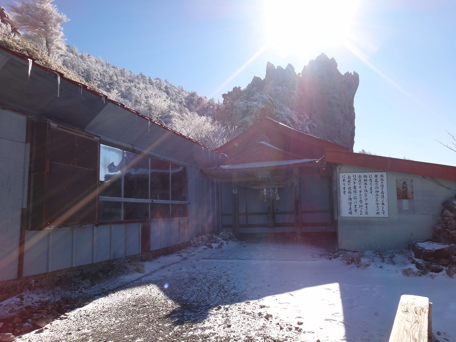 とりあえず山頂を踏んで、雲海荘の前でお昼ごはん。 風が吹いていて少し寒かった…… 山頂ヒュッテの前には誰も行っておらず足あとがついていなかったが、写真に撮りたいのと温度を見たいので、広場から降りて見に行ってきた。 温度はマイナス6度だった。