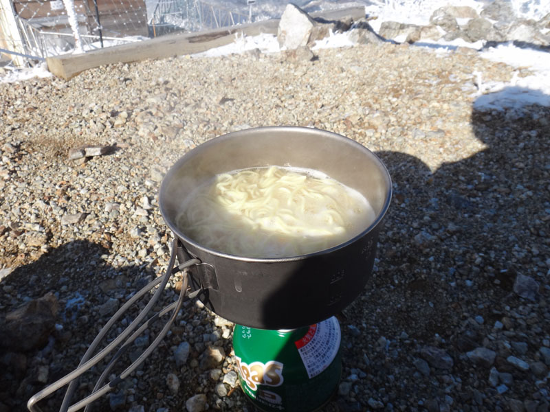 ダウンを着て、インスタントラーメンとおにぎりを食べる。 寒すぎて全然お湯が沸かなかった。 ラーメン作るのに15分くらいかかってしまった。