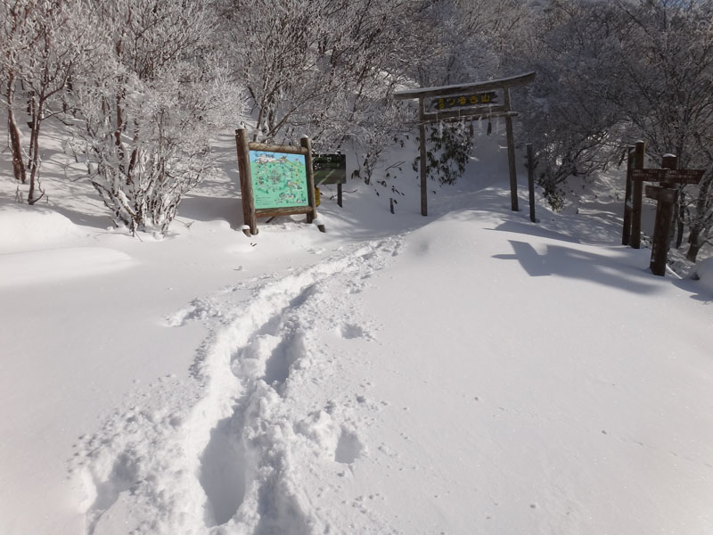神社の脇から登山道に入る。 登山道にはスノーシューのトレースがついていて、それを使って歩いて行く。 踏み抜きもせずけっこう快適に歩けるな。 リフトのトンネル潜る前に40歳代くらいの単独の女性を抜かす。 だがこの女性スパッツもつけてなく、この時点でフラフラだけど大丈夫だろうか?