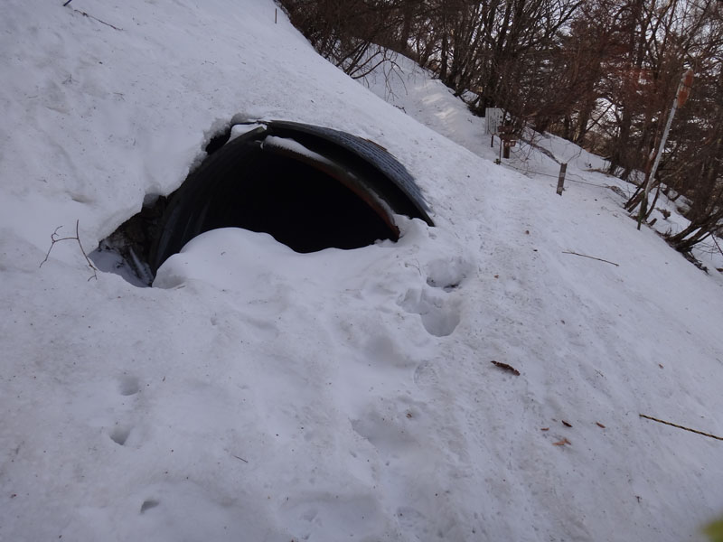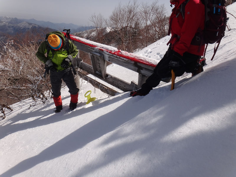 谷間を横断するところは雪がものすごい積もっており、全然前に進めなかった。 右足を一歩踏み込むと腰くらいまで埋まる。 ストックでバランスを取りながら左足の膝で雪を崩して左足を乗せると右足と同じくらいまで沈む。 目の前には腰以上の高さの雪壁が残る。 ストックで雪を手前に落とす。 右膝で雪を崩して一歩踏み込む、左膝で…… と繰り返せば、平坦な道は進めるのだけど、傾斜がついているとそれをやっても全く進めないことがよくある。
