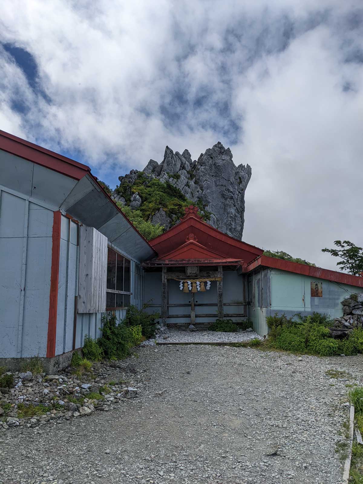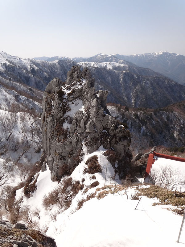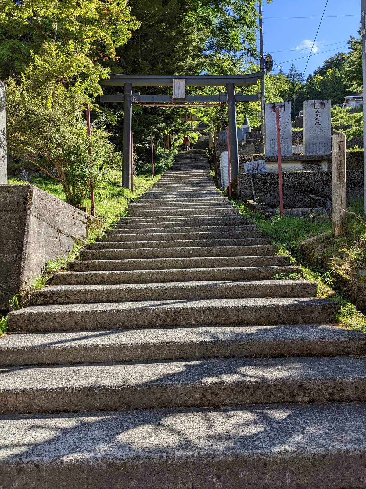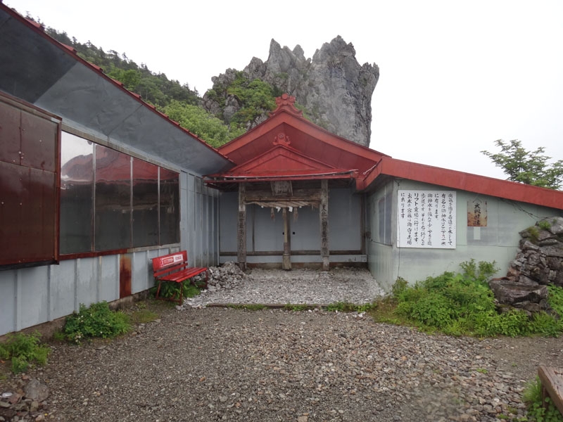 西島出てから1時間5分、ようやく大剣神社に到着した…… さすがにくたびれたのでここで休憩。 おにぎりを1つ食べ、エネルギーを補給する。 さて、ここでようやく半分くらい。 山頂まで、今と同じくらいの苦労をすることになるかも。