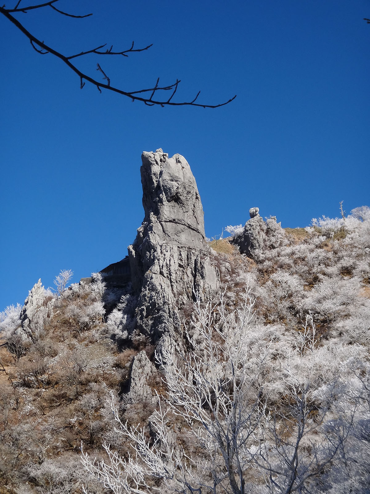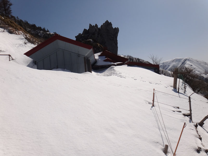 谷間ではない、普通の場所なのだけど、積雪がすさまじい。 一歩ごとに腰まで沈み込む。 次の一歩が高くて重くて足が上がらない…… そんなのが50mくらい続く。 その50m進むのに20分以上かかっている。 写真に撮ったのだけど、ストックの長さが110cm、目の前に大剣神社の岩が見えているのだけど、さすがに息と太ももの筋肉を整えた……