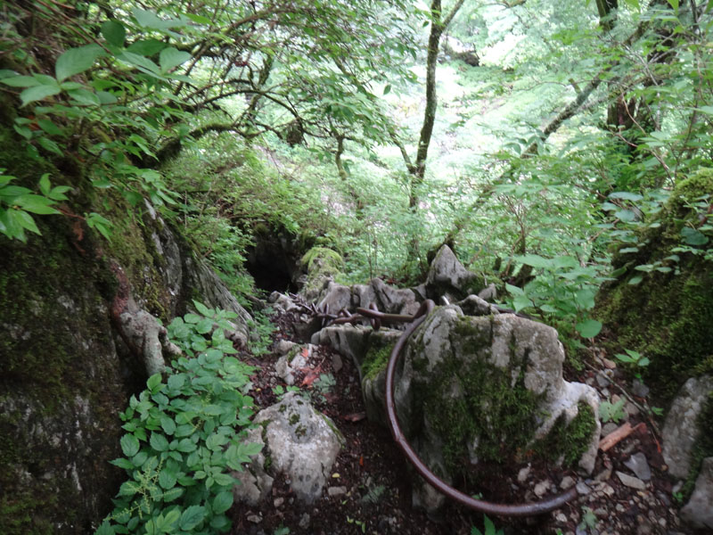 お花畑を通過して、登山道に合流。 穴吹川源流の谷を越えて、巨大な岩の下にあるお堂から、上に上がっていく。 鎖場を通って山頂を目指そう。 剣山の鎖場は石灰岩。 みんなが通るので、その箇所はツルツルになっていて滑りそうで怖い。 鎖場は狭く、ザックがピッタリくらいのサイズ。 鎖場は怖くないのだけど、鎖の付け根を見ると、いつも怖くなる。 ずっとこれで支えているから大丈夫なのだろうけど、支点が頼りないように見えて仕方がない……