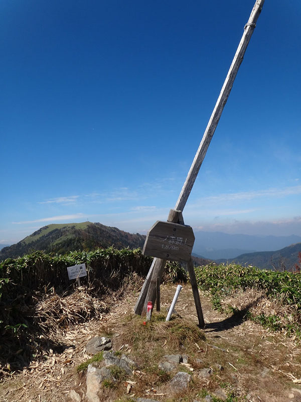 ヒュッテ前のベンチでおにぎり1つ食べて休憩をする。 一ノ森山頂では、徳島市内からやってきたという40代くらいの夫婦と会話、見ノ越を6時半に出発して次郎笈→剣山→一ノ森と4時間半ほどで歩いてきたみたい。 装備はまだ整っていない初心者だと言っていたが、健脚だな。 ここからは下るだけだし楽ちんかなとか思いながら、オレは剣山を目指す。