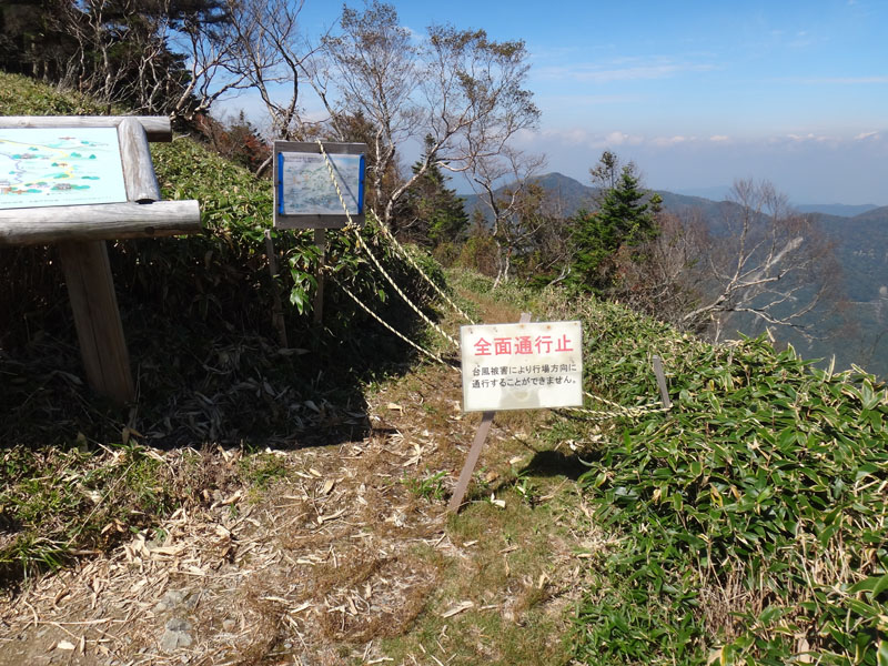が、一ノ森下りてすぐのところに、お花畑方面へのルートがあるのだけど、通行止めとなっていた。 あれ? 何かあったのか? ここが通行止めだったら、先ほどの人たち、見ノ越に帰るのに、剣山を登り返さないといけないな。