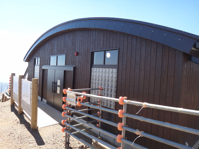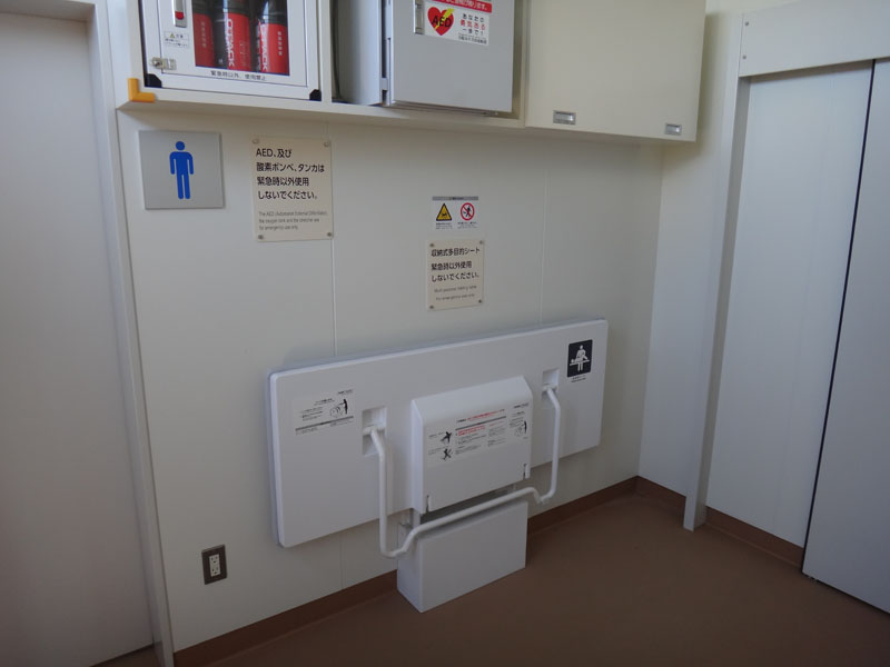 新しく完成したという頂上トイレを見学してきた。 ドアは横開きの半自動。 入ってすぐの所が6帖くらいのスペースでそこに赤ちゃんのオムツ替え用のベッドがついていた。 正面が多目的トイレ。 男子トイレに個室は2つ+1。 洋式1、和式1、もう一つは何かわからなかった、体の不自由な人用? イスとスペースはあったけど、便器みたいなのはなかったけれど。