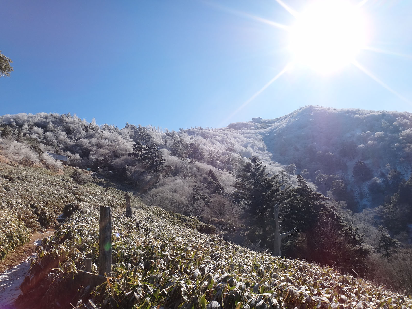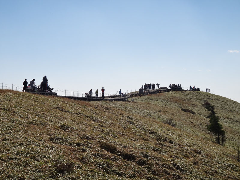 そのまま一気に見ノ越まで下りていく。 見ノ越に向かっている途中で、この時間から登ってくるグループと2組すれ違った。 1組目は単独男性で、長靴ででかいカメラを持っていたので写真撮影が目的っぽい。 2組目は若い男性2人組で、見ノ越に来たから登ってみるか、みたいな装備だった。