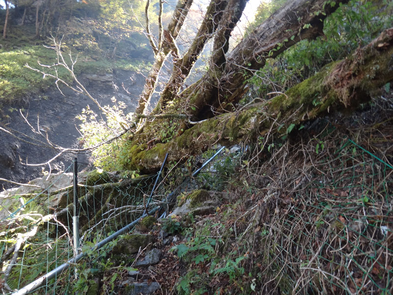 そして異変に気づく。 今度は下に向かって右側の崖が崩れているように見える。 鹿除けのネットが張り巡らされているのだけど、そのネットを支える支柱が大木に押しつぶされている。 道もかろうじて、大木の下をくぐるような感じで通ることができる。 6月はこんなだったっけ? その大木をくぐって下に下りたらさらなる異変が。