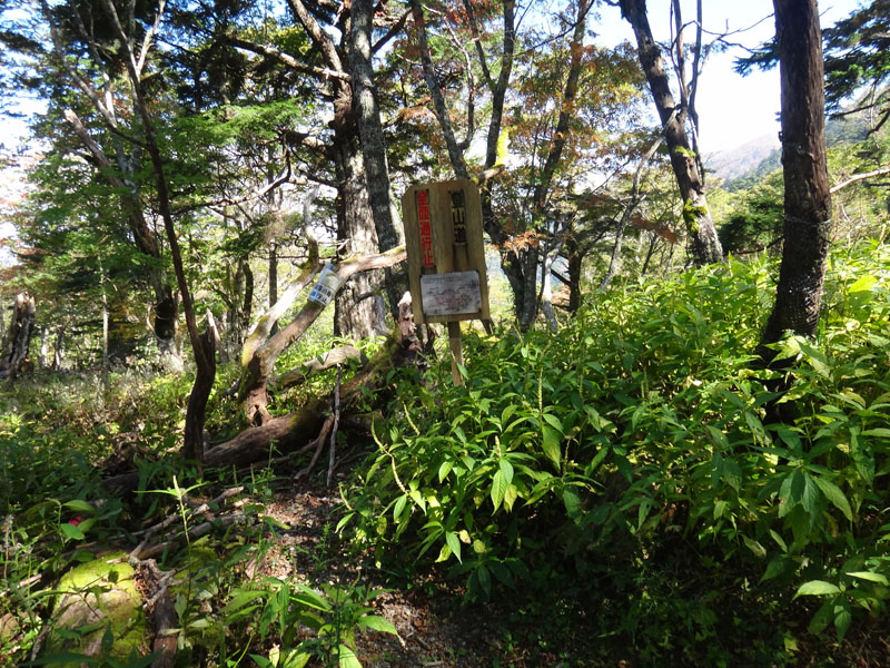 大剣神社から下の道に下りて、次郎笈を目指す。 剣山~次郎笈のルートに合流して、次郎笈に向けての登りが始まる。 次郎笈のトラヴァースルート分岐までやってきた。 行きはトラヴァースルートを歩いて西側から登り、帰りは普通に下りよう。