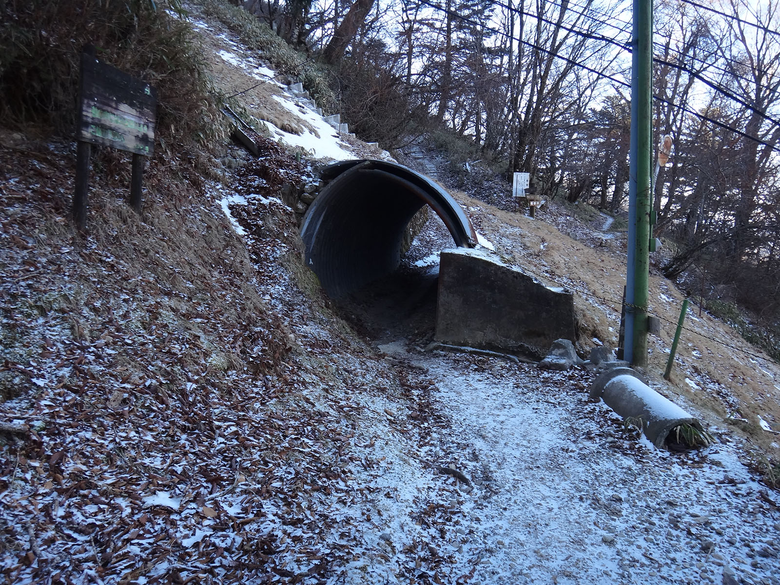 崩落地は、崩れた岩で安定していないし、次の大雨とかあったらまた崩れるだろうし、しばらくは通行止めが続きそうだ。 通行止めが続くと歩く人がいなくなって道が廃れる。 ただでさえあまり人がこない道なので、このまま廃道になってしまうかもしれない。