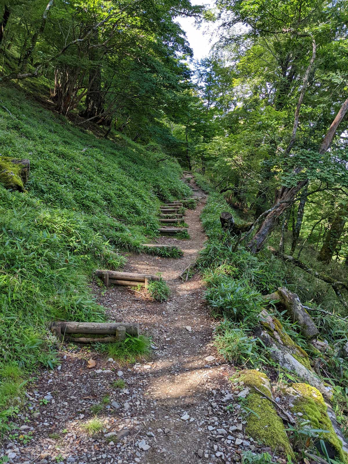 登山の準備をして出発。 林道を5度ほど横断するこの登山道をグイグイと登っていく。 4度目の横断の時、林道を歩いてきた60代くらいの夫婦と遭遇。 このルート初めてで登山道ではなく林道を上がってきたみたい。 林道を歩いたら3.5km、登山道を歩いたら1時間20分がコースタイム。 どちらもあまり変わらないかもしれない。