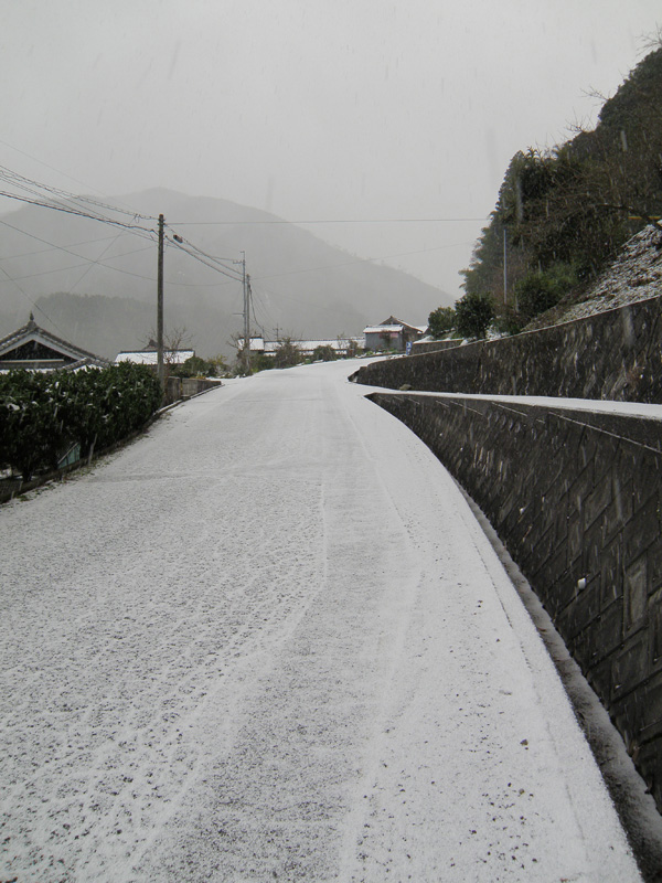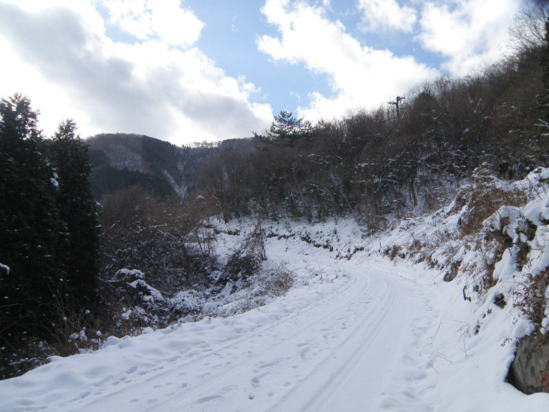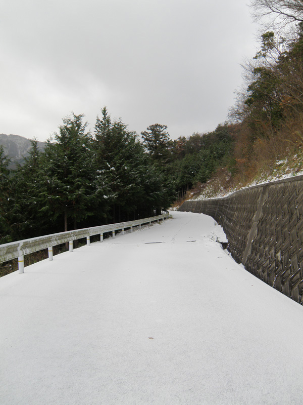 今回は、琴南の公民館にバイクを止めて、そこから登山口まで歩く。 公民館手前にある山を越える道の途中で激しい雪が降ってきた…… そして山を越えると……一面の銀世界。 高松から直線距離でわずか20kmほど。 こんなに状況が変わるものなのだろうか。
