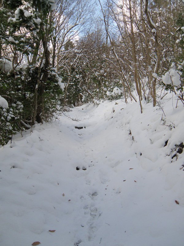 雪で地面の様子がよくわからないが、道自体は木道で整備されてるような感じ。 木道で整備されているということは、けっこう急なみちなのかなぁ。 標高自体は公民館から800mほど上がるみたい。