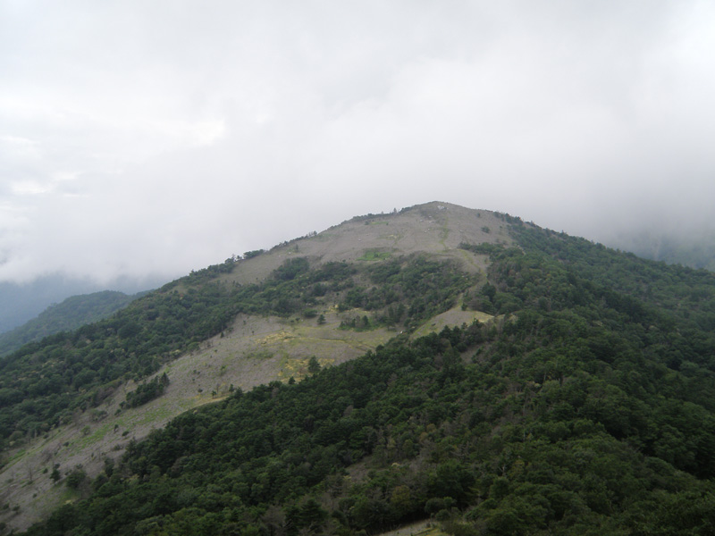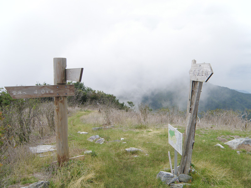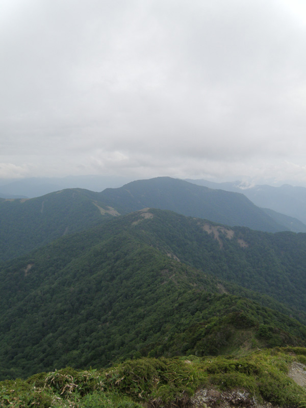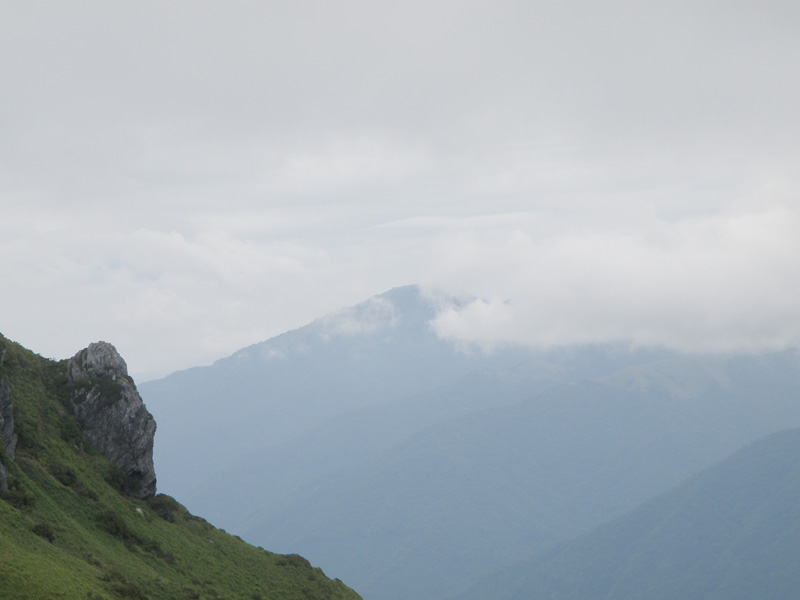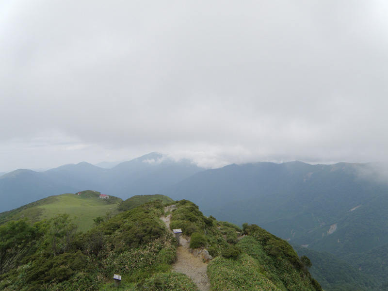 今回のルート、ようやく終わりが見えてきたな。 三嶺まで2時間ほど、そこから駐車場までが2時間ほど。 雨で外では休めないので、次の休憩する場所は、三嶺避難小屋。 この避難小屋でたっぷり体力を回復しておかなくては、三嶺最後の登りはきつい。
