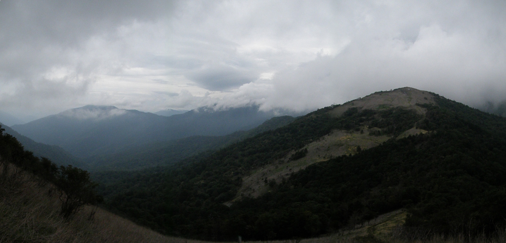 先に進むと、平坦な笹原に到着。 ここからの景色が素晴らしいらしいのだが……今見える景色はこんな。