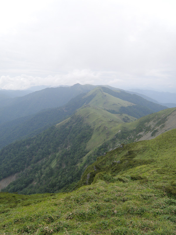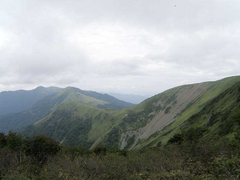 高ノ瀬からの下りの途中で、女性2名のパーティとすれ違った。 この時間にここにいて、三嶺方面に歩いて行くという事は、今日は白髪避難小屋泊まりか? それともその付近に野営か?