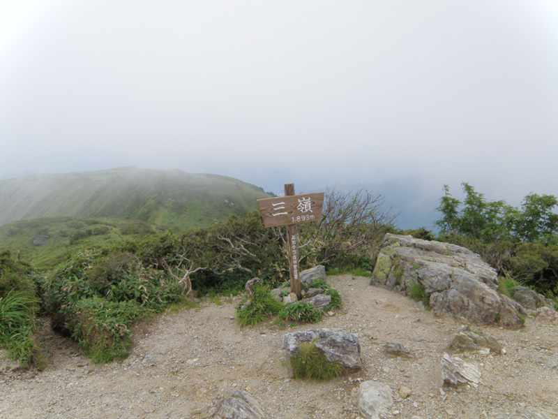 急な登りに耐え、三嶺山頂に到着。 もちろん景色は何も見えない。