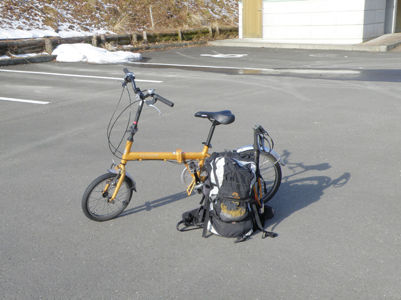名頃駐車場に着いた時には結構遅くなってしまった。 ここから先は冬季通行止めのはずなので、車はここに止めて、登山口までの2.6kmは自転車で移動する。 といっても、登山口までずっと上り坂なので、ほとんど歩きだろう…… 自転車は帰りのため。 すごい楽ちんなはず。