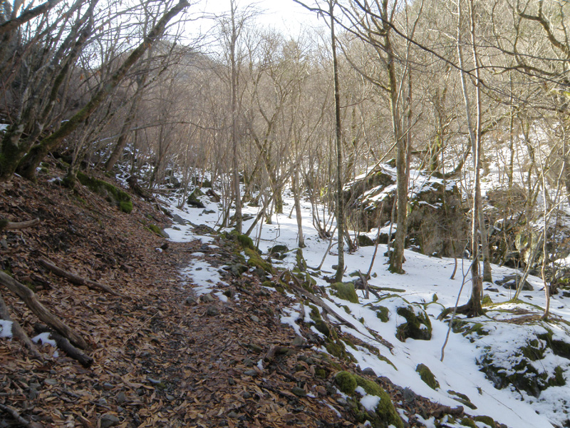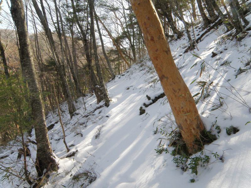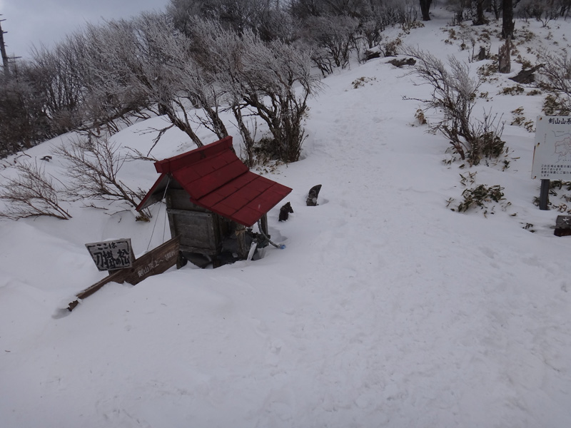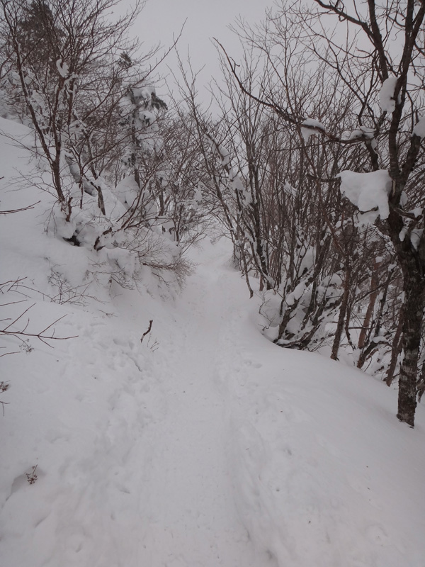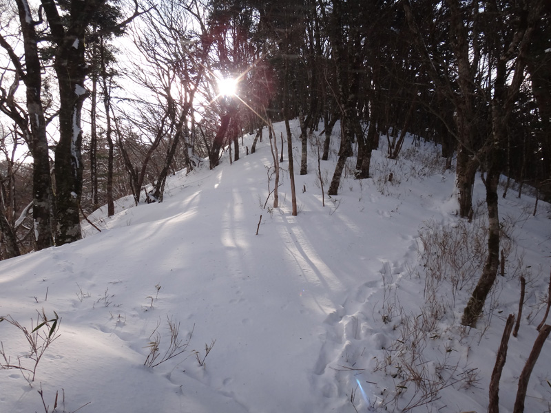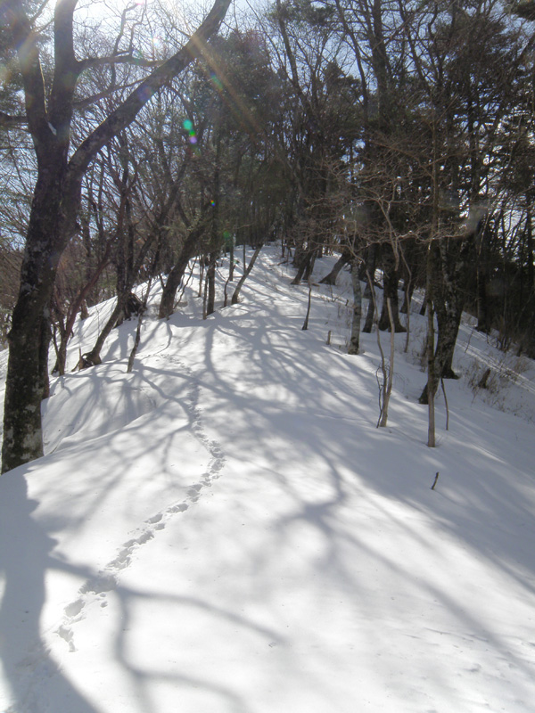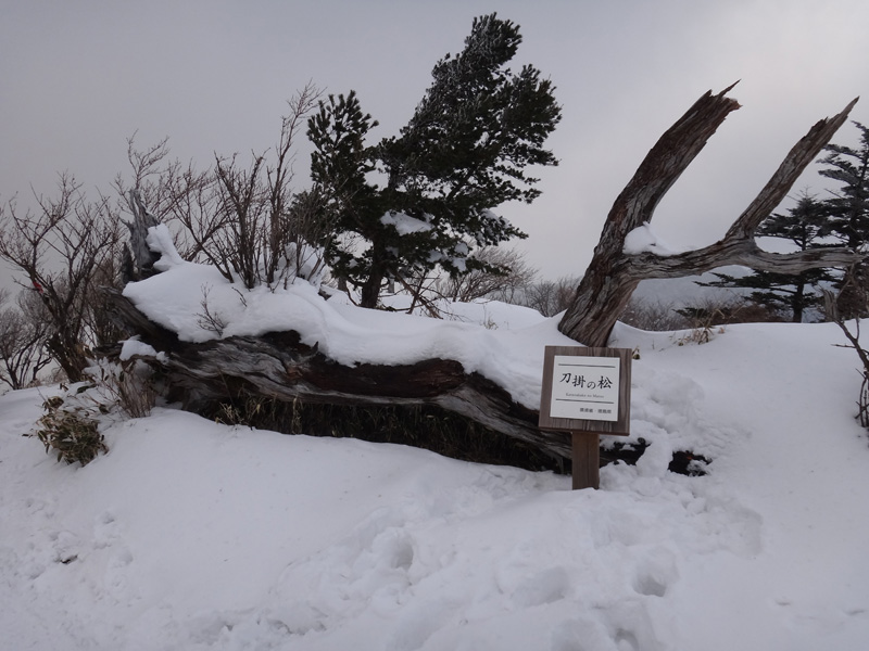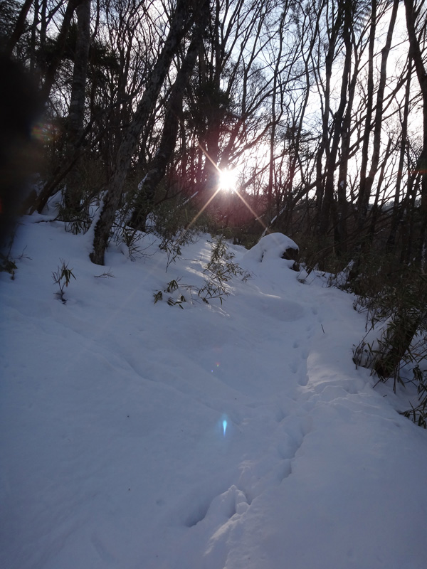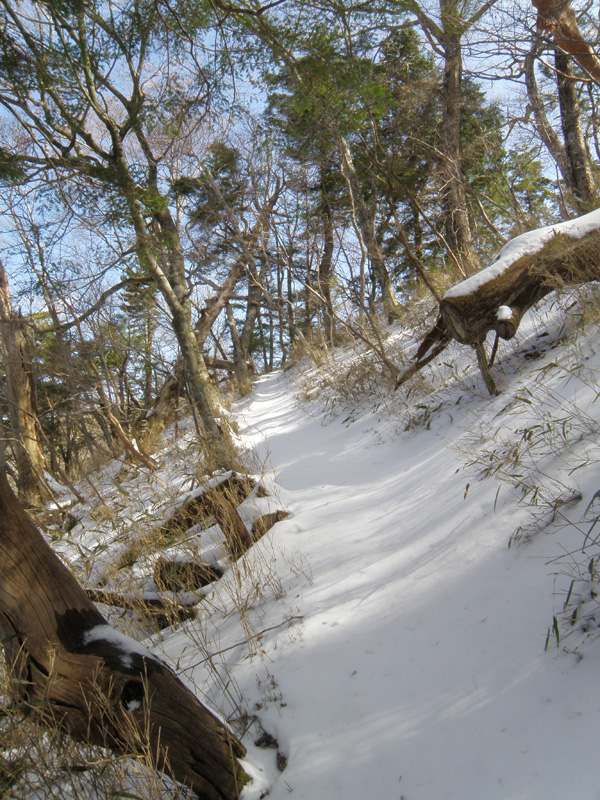 最短ルートの刀掛の松経由で。 こちらはけっこう人が歩いた後があり、雪がしっかりと踏み固められている。 アイゼンも付けてない状態なので、けっこう滑るが、その滑る力を利用して降りて行く。