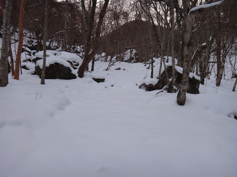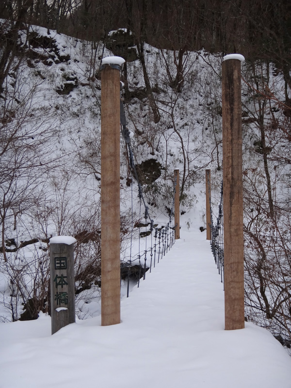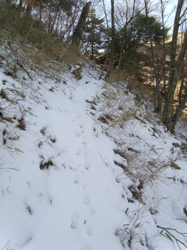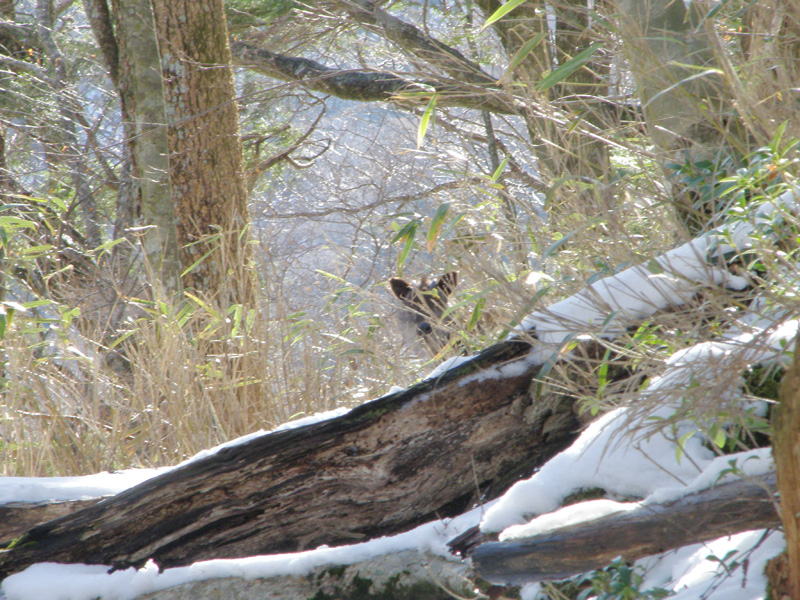 なだらかな道を国体橋に向かって歩いていく。 所々、10~20cmくらいの雪が積もっている程度。 途中でニホンカモシカに遭遇。 すぐに逃げられてしまったが…… やはりこの時期は遭遇率が高いなぁ。