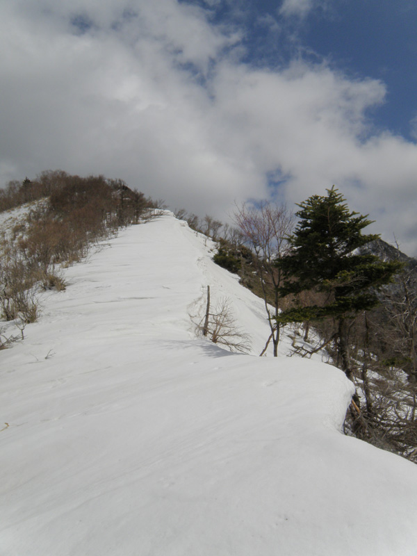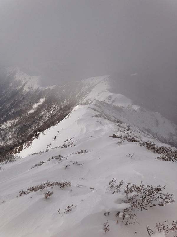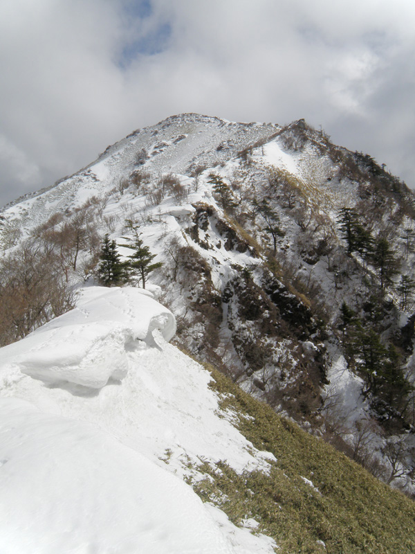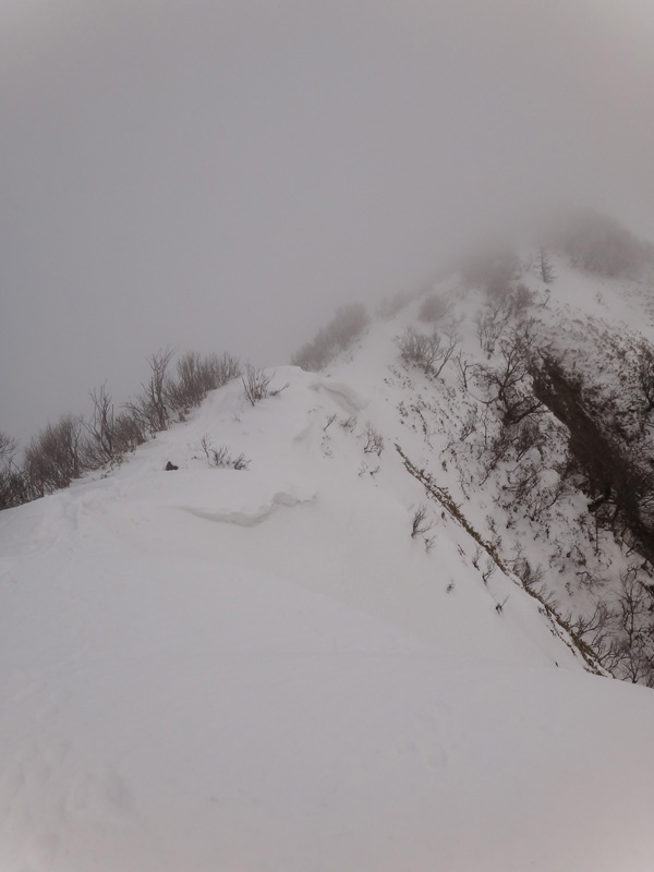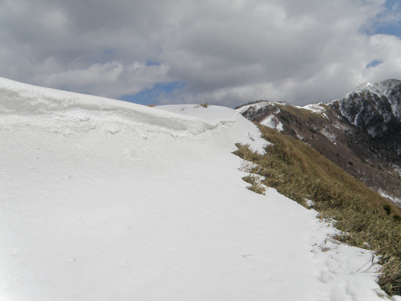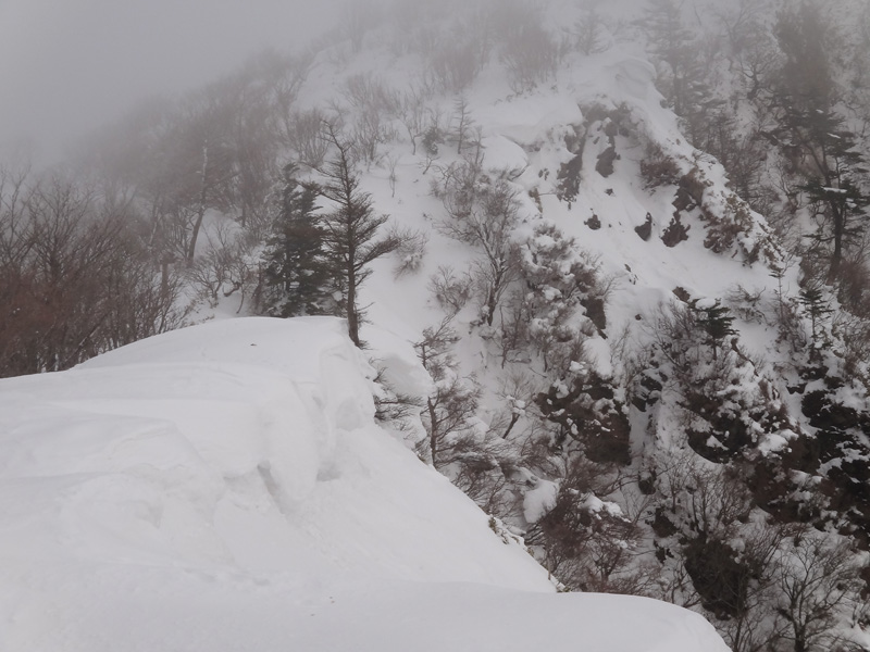 次郎笈直登のルートを進むが、ここからは更に傾斜がきつくなる。 恐ろしい雪庇も形成されているし、慎重に行かなくては……