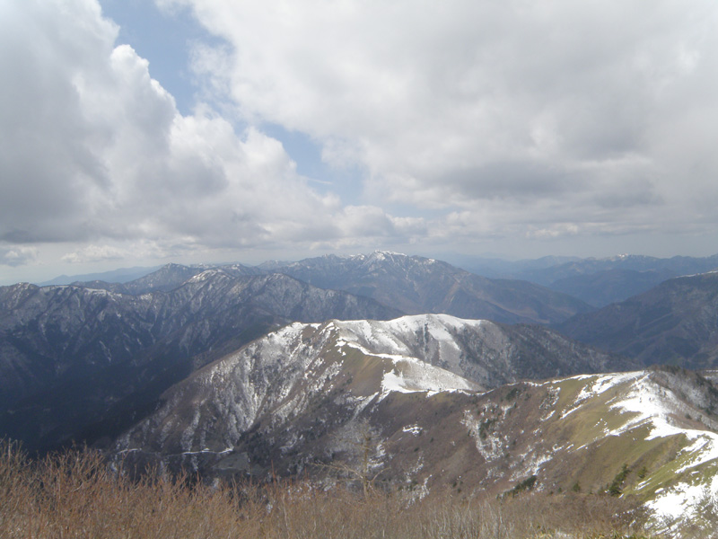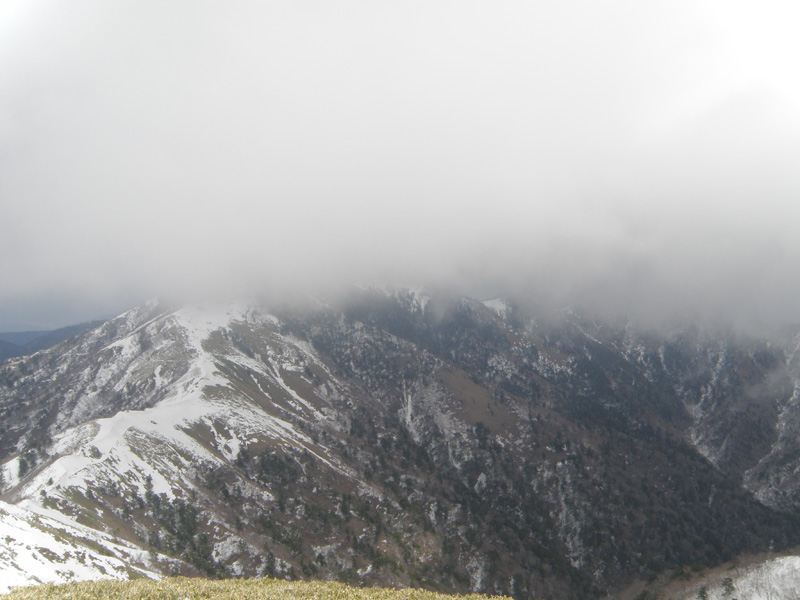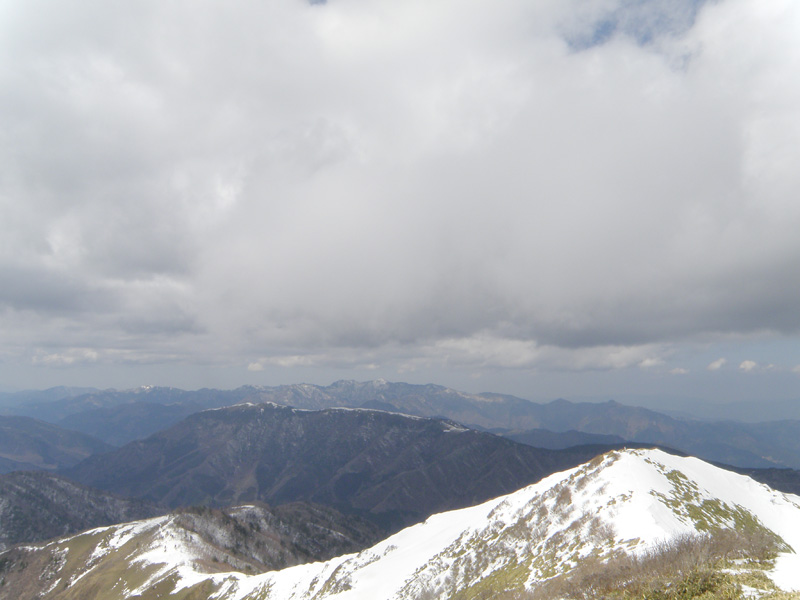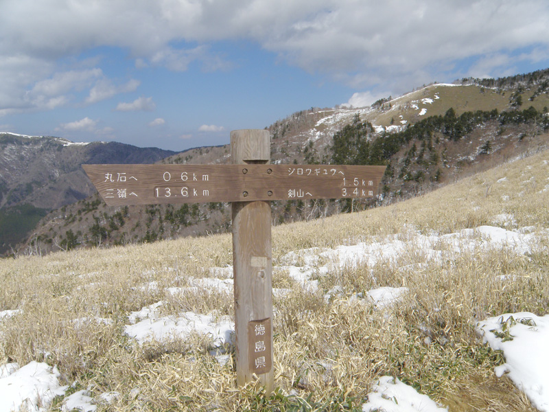 ここで、休憩でも、と思ったのだが、なんだか天候があやしくなってきた。 さっきまで快晴だったのに、剣山は雲に覆われて見えない。 南側にも黒い雲が出現。 風はあまりないが、長居しない方がよさそうだ……
