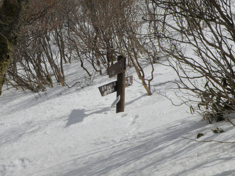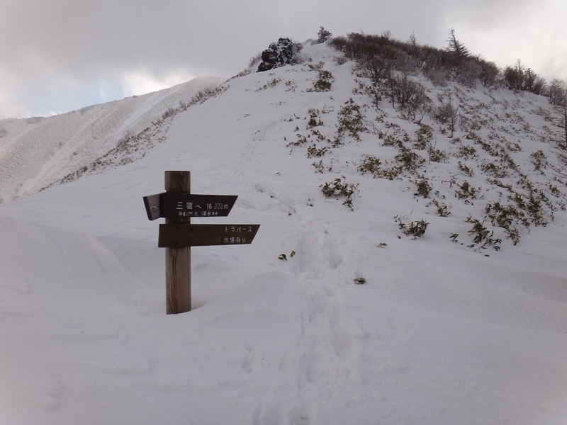 バテバテになりながらトラヴァース分岐まで到着。 トラヴァースルートは雪に覆われていて全く見えない。 地図にも「積雪期は危険」と書いてある。 雪崩がくるかな……
