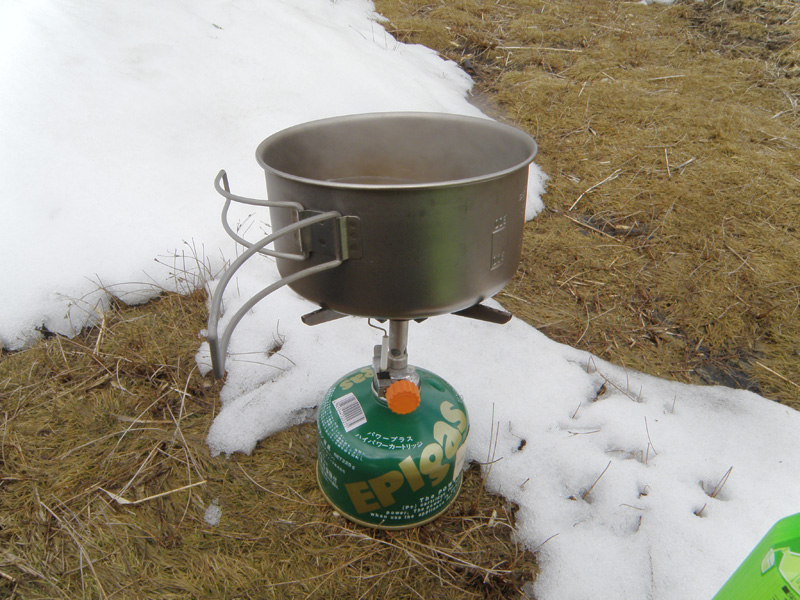 スープをほとんど飲み干して、わずかに残ったものを使って雪から水を作る練習をしていた。 すると上から人が歩いてきた。 まさかこのルートを人が歩くとは思っていなかったので、ビックリ。