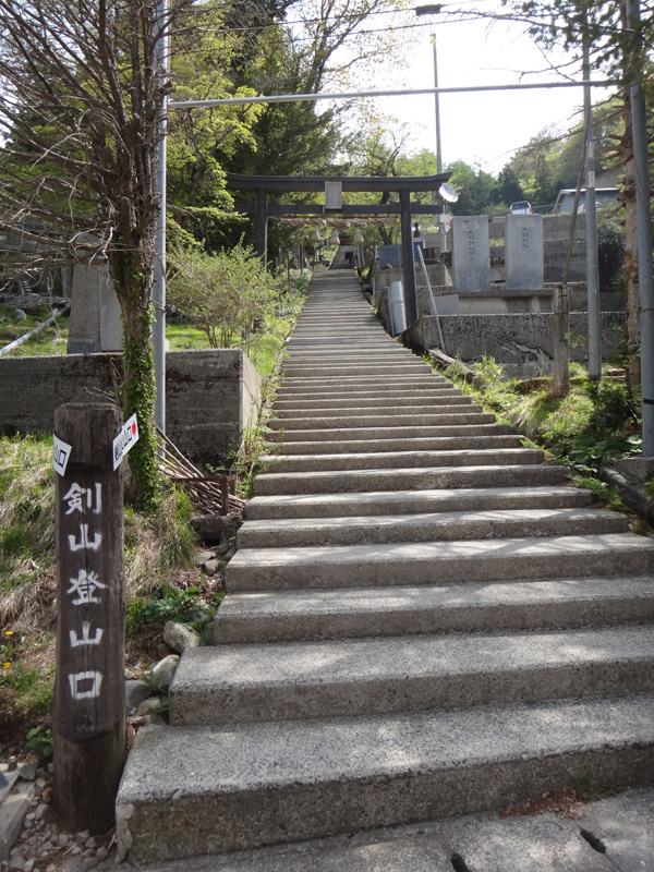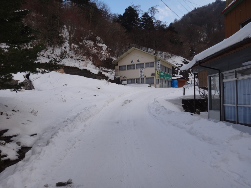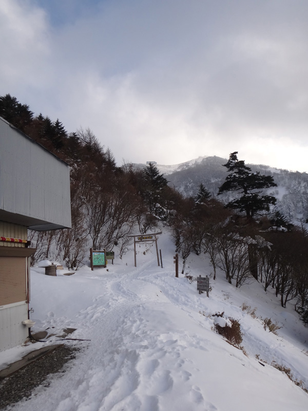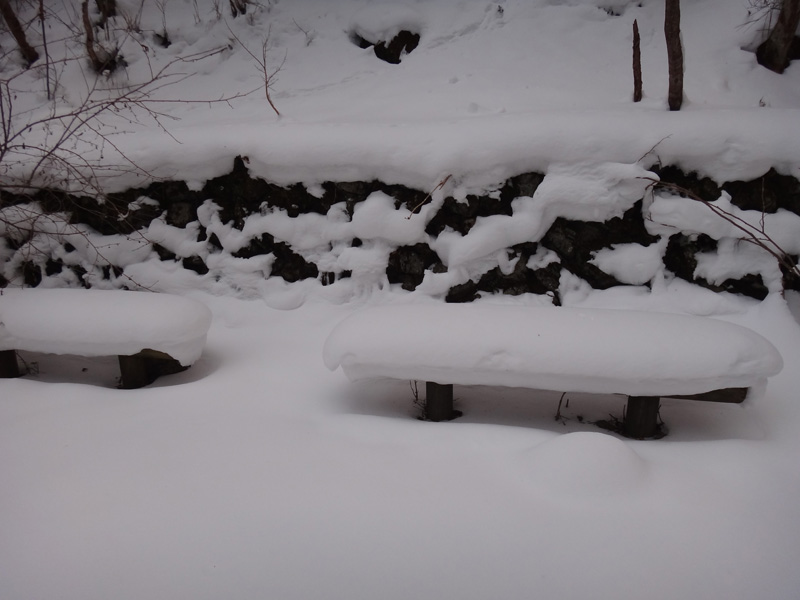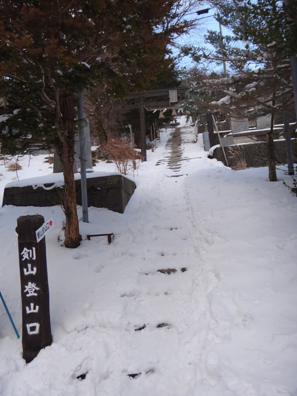 まずは大剣神社まで。 去年の大雪ではかなり苦戦しながら歩いた大剣神社までもほとんど雪が無い。 谷間で常時日陰の場所だけ、少し白い景色だったけれど、それでも積雪5cmくらい。 これがこの日の積雪のピークだった。