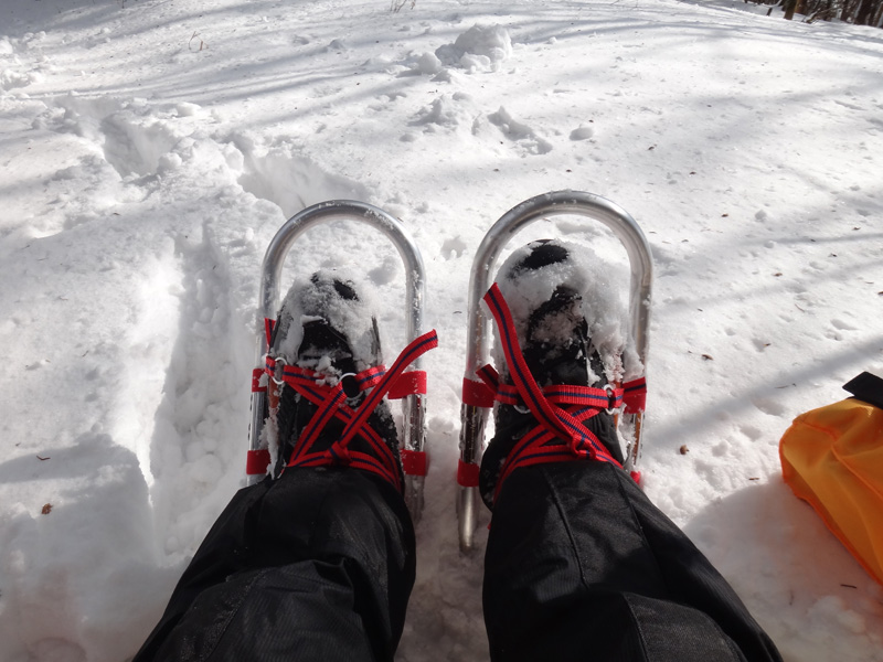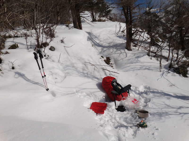 登りはメチャメチャ苦労した道なのだが、下りは楽ちん。 雪がクッションになるし、とても歩きやすい。 あっという間に、スーパー林道分岐まで下ってきた。 だいぶ疲れたので、ここでお茶を温めて飲む。 今日は気温が高いので寒くはないが、体が暖まるなぁ。