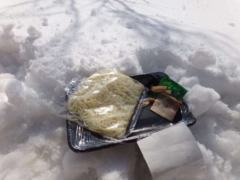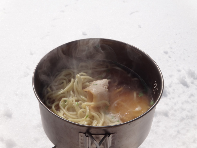 今日の温かい一品はラーメン。 さっそくスープを温めてラーメンを食べる。 体がポカポカ、とても温かかった。