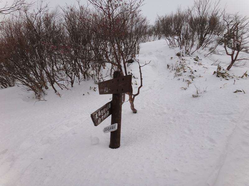 剣山方面へのトラヴァースルートへの分岐まで到着。 ここから更に雪が深くなる。 雪庇も出現。 雪庇を避けるように、本来のルートを大幅に外れて笹原の上を歩くようトレースがついていた。 それを利用するが、笹原は沈みまくる……