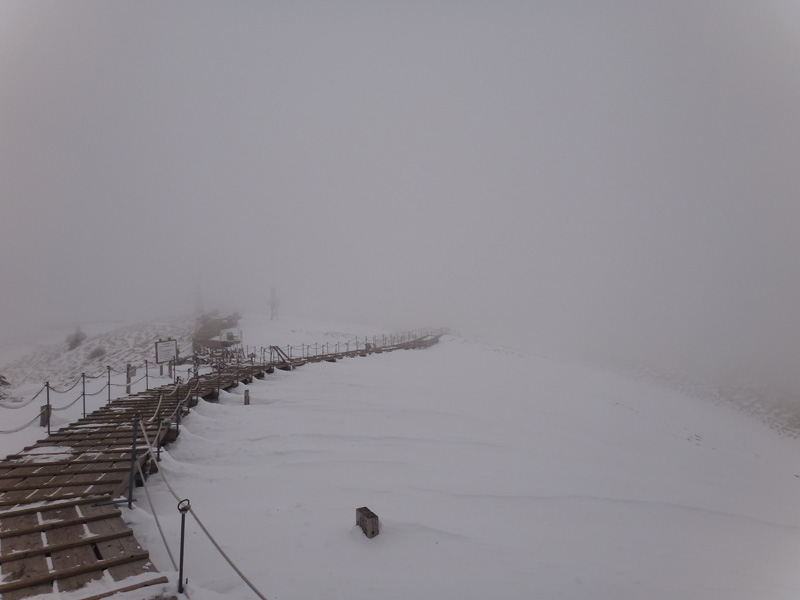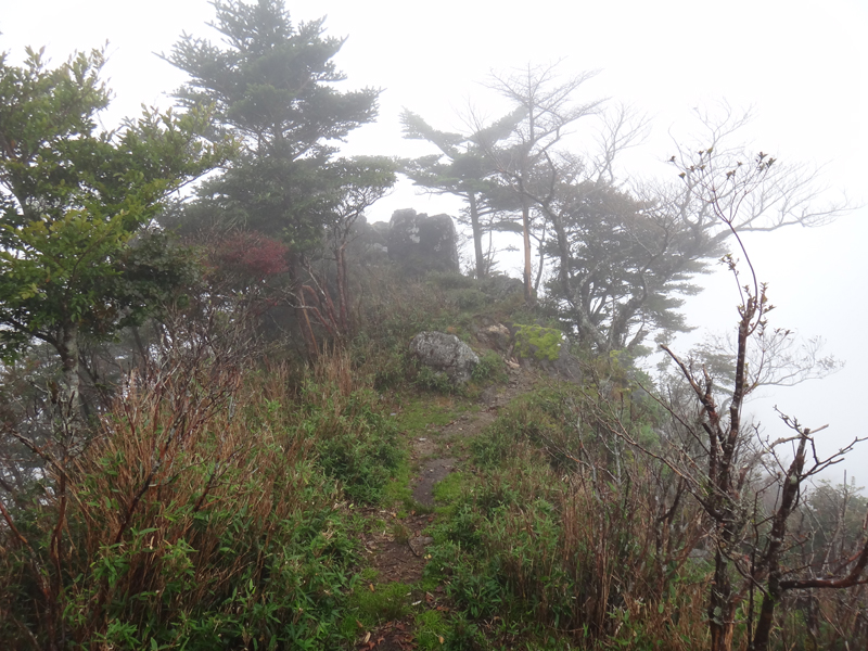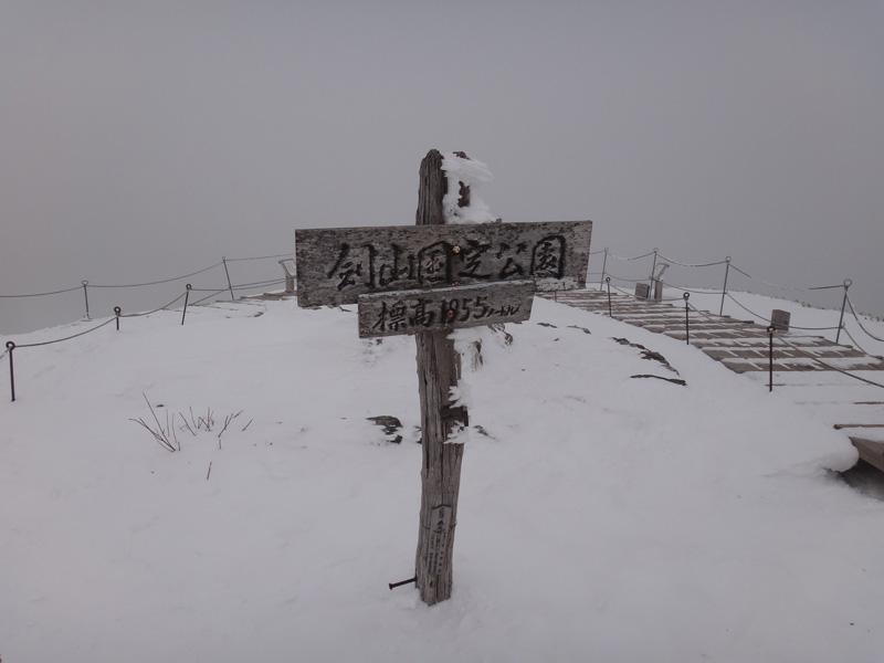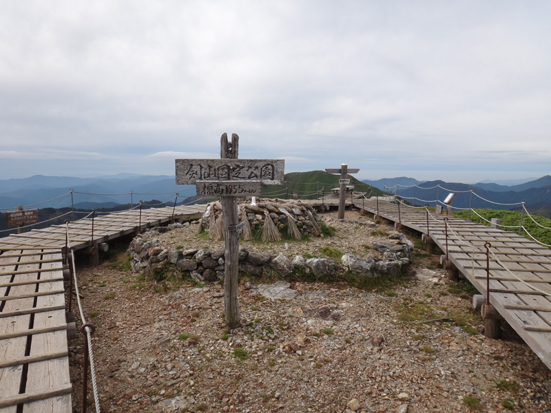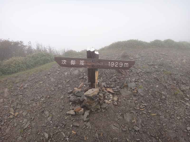 山小屋で休憩もして、レインコートも着込んで出発。 とりあえず山頂を踏まなくては。 すぐに剱山の山頂に到着。 そして、天気が悪いけれど、次郎笈に行くことに。 元々の予定でも、次郎笈は行く予定になっていた。