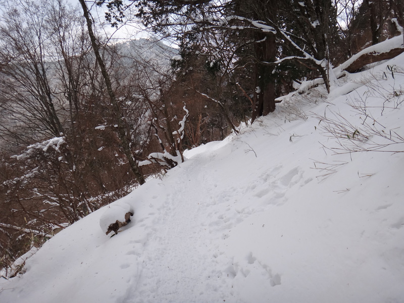 左右にグネグネしながら登っていく。 道幅は狭く、斜面上に雪が積もっている。 シャーベット状の雪なので、踏むとそのまま滑る。 で、谷側にけっこう足が持っていかれるので、めちゃめちゃ歩きにくい。 アイゼン使えばマシになるかもしれないけど、この状況でアイゼン使うのもなぁ……