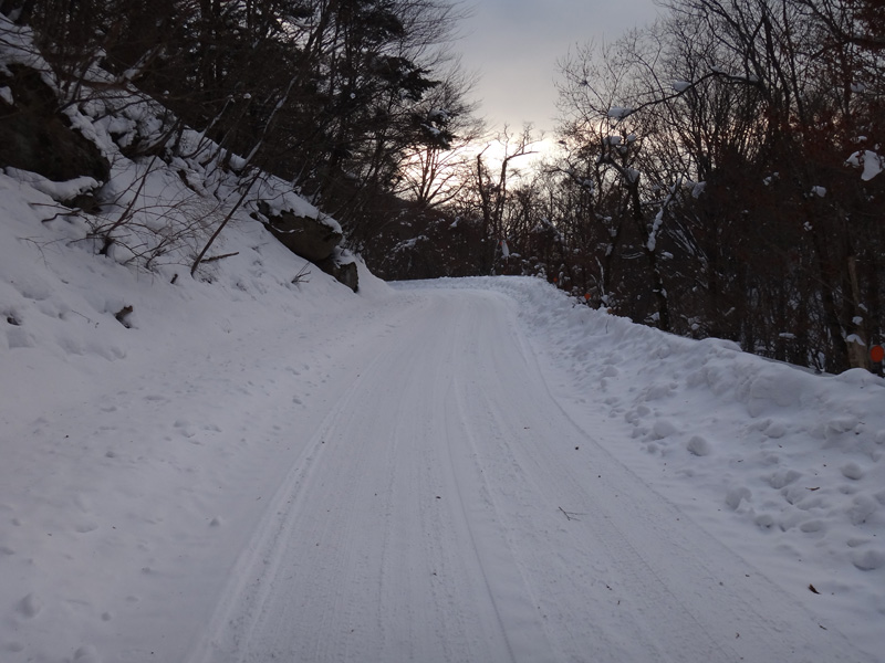 10分ほど歩き、製薬会社の保養所辺りまで歩いてきた。 ずっと下り坂だし、少し走ってみようかな。 いつもジョギングするよりゆっくりのペースだけど、走ってみた。 雪で滑らないように気を付けて、ザックが振動で暴れるので紐を締めつけて押さえつけて、登山靴は硬くて足が痛くなりそうだけど、足にも我慢してもらって走る。 25分くらいは走れたかもしれない。 下り坂なのに息が上がる。