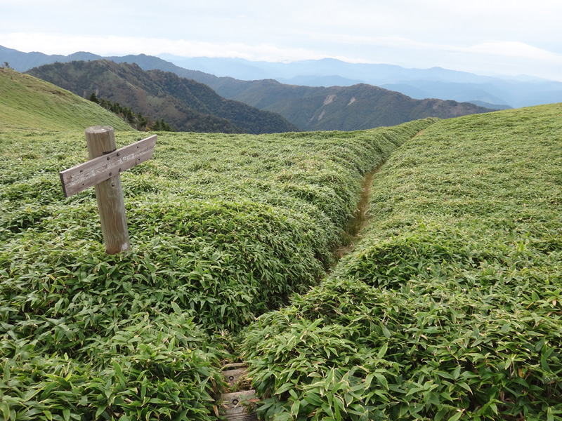 大剣神社から下の道に下りて、次郎笈を目指す。 剣山~次郎笈のルートに合流して、次郎笈に向けての登りが始まる。 次郎笈のトラヴァースルート分岐までやってきた。 行きはトラヴァースルートを歩いて西側から登り、帰りは普通に下りよう。
